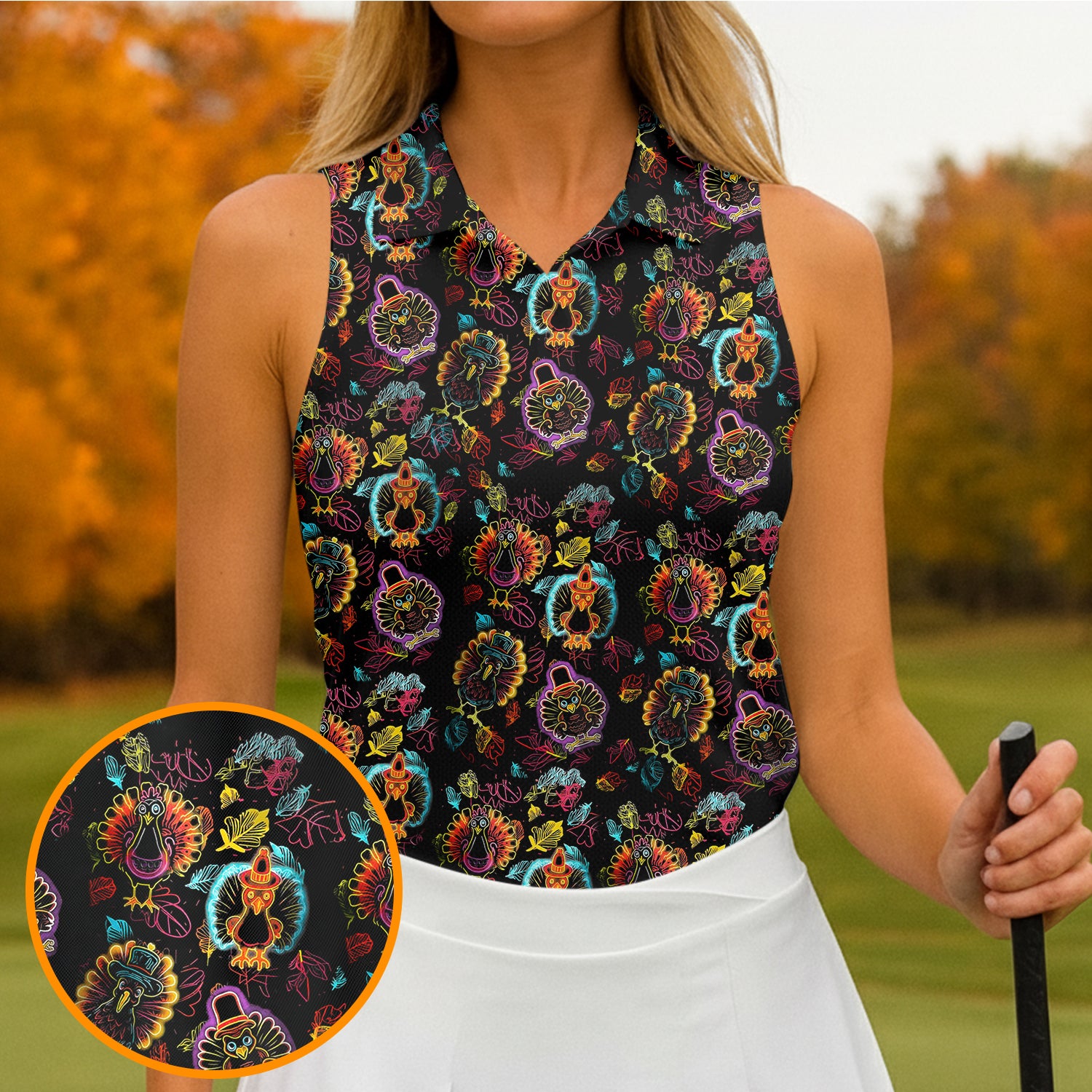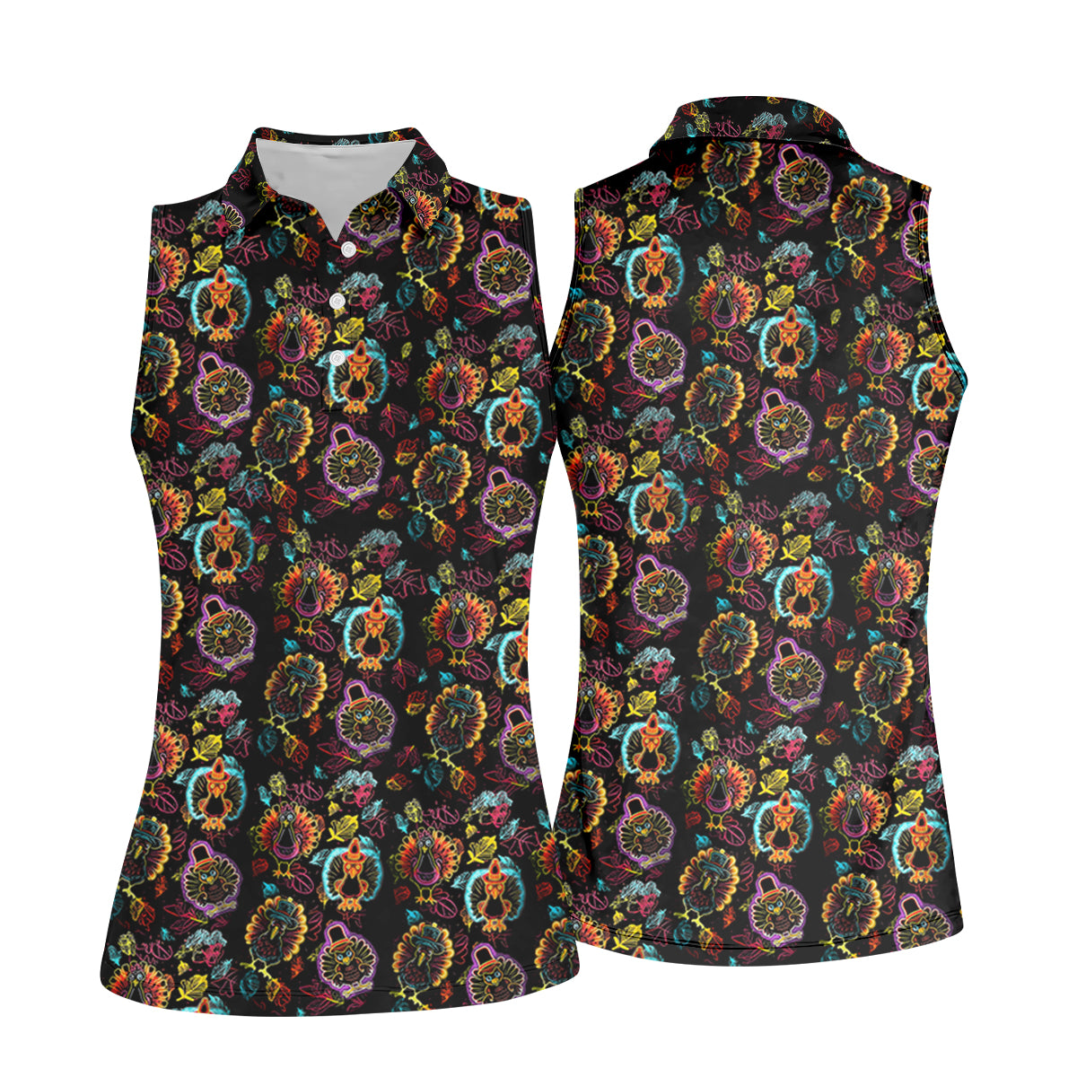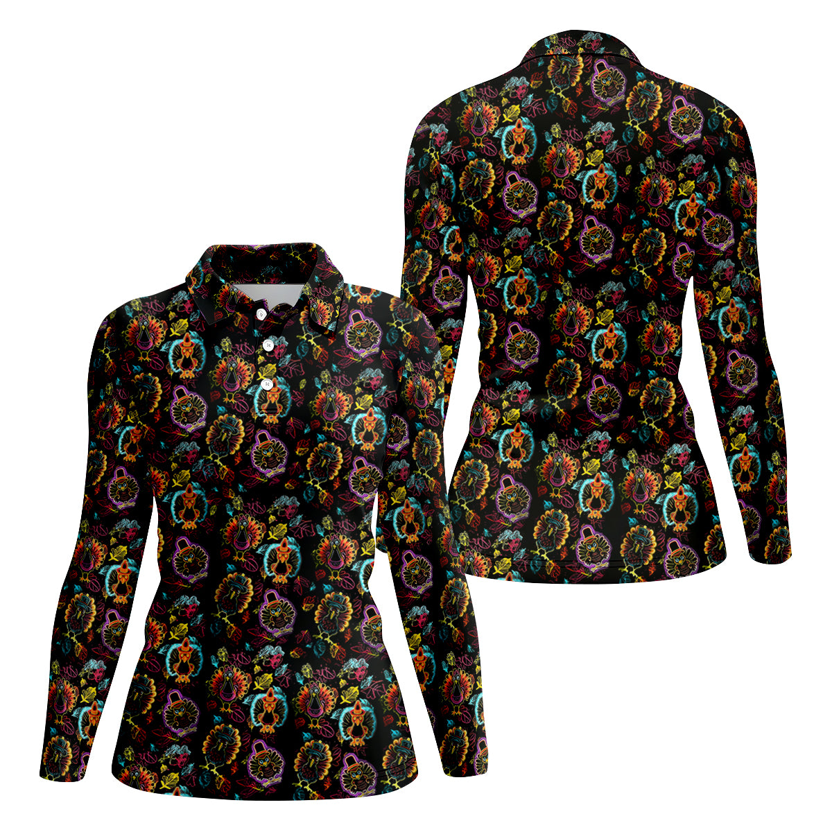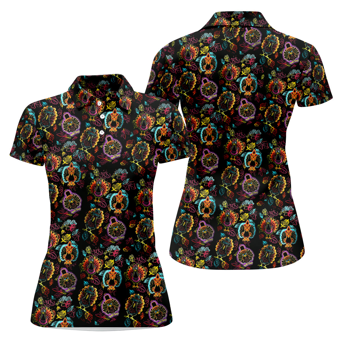Neon Turkey Thanksgiving Fun Women's Golf Shirts, Women Golf Top, Ladies Golf Polos, Golfing Apparel