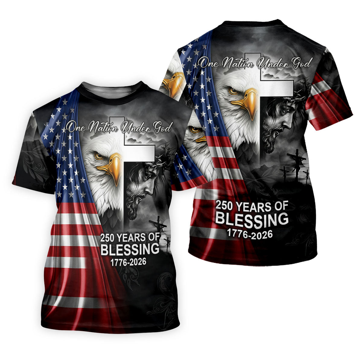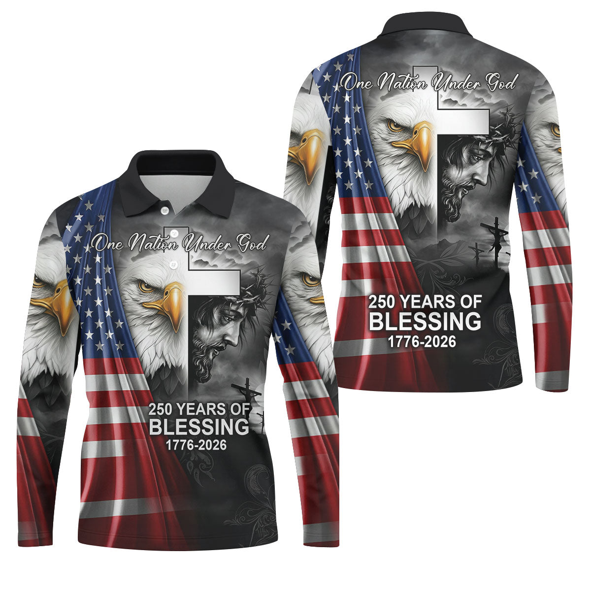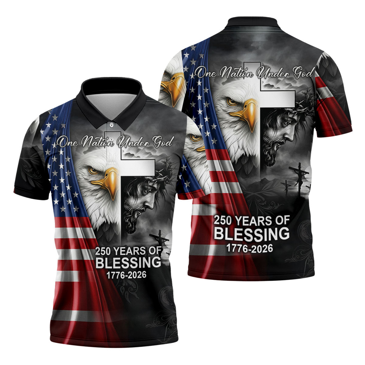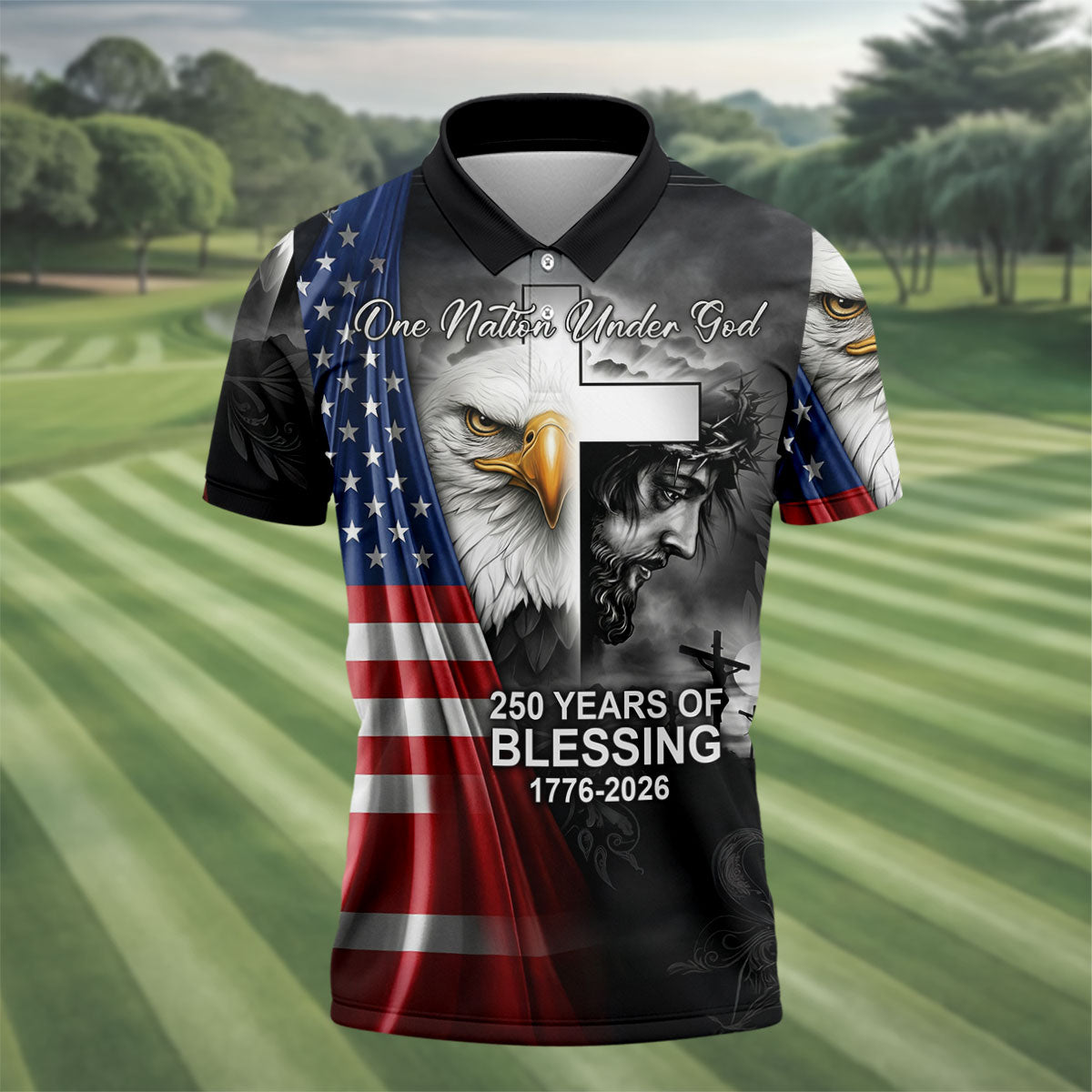 One Nation Under God 250 Years Of Blessing Faith Cross US Flag Golf Shirt, 4th Of July Golf Shirts For Men
