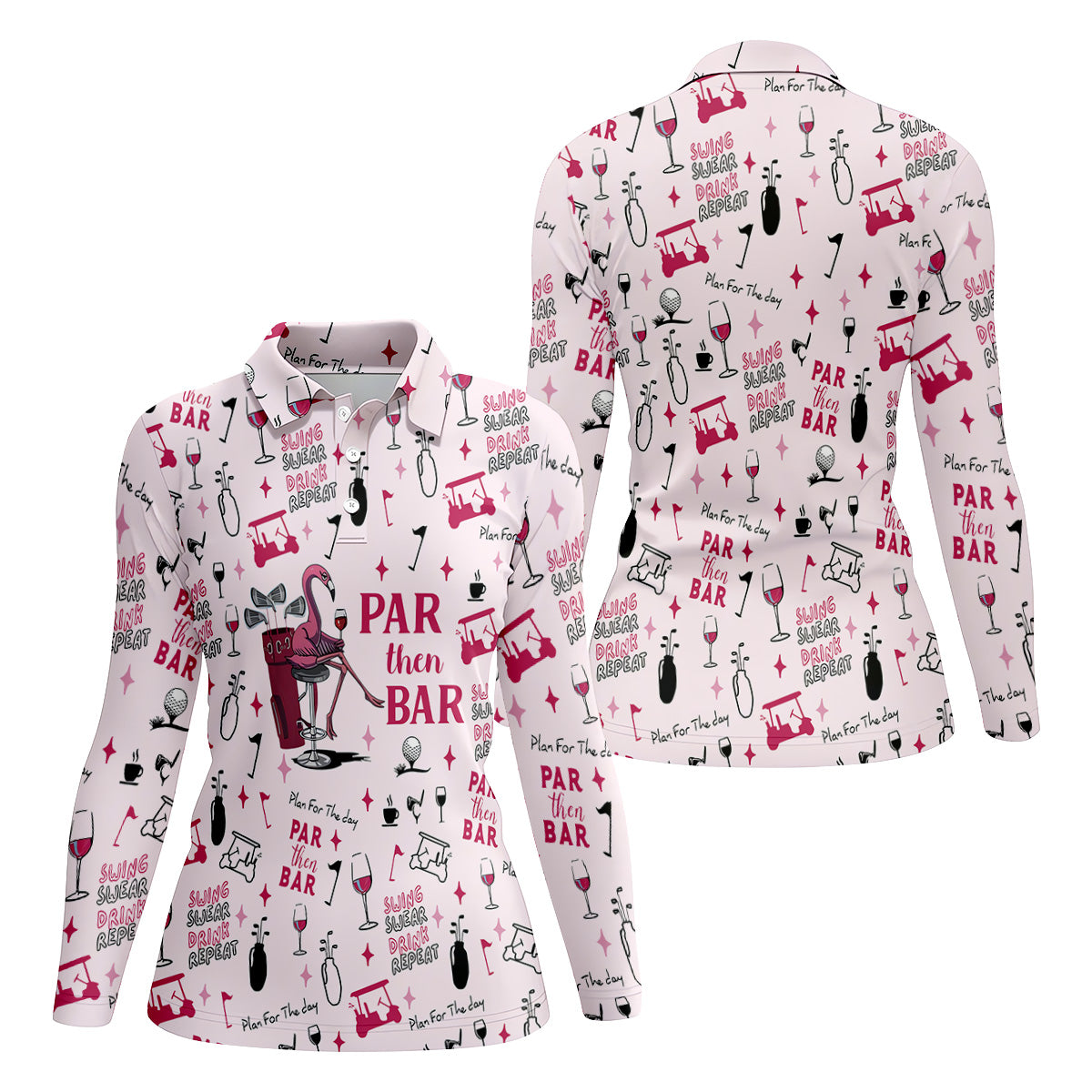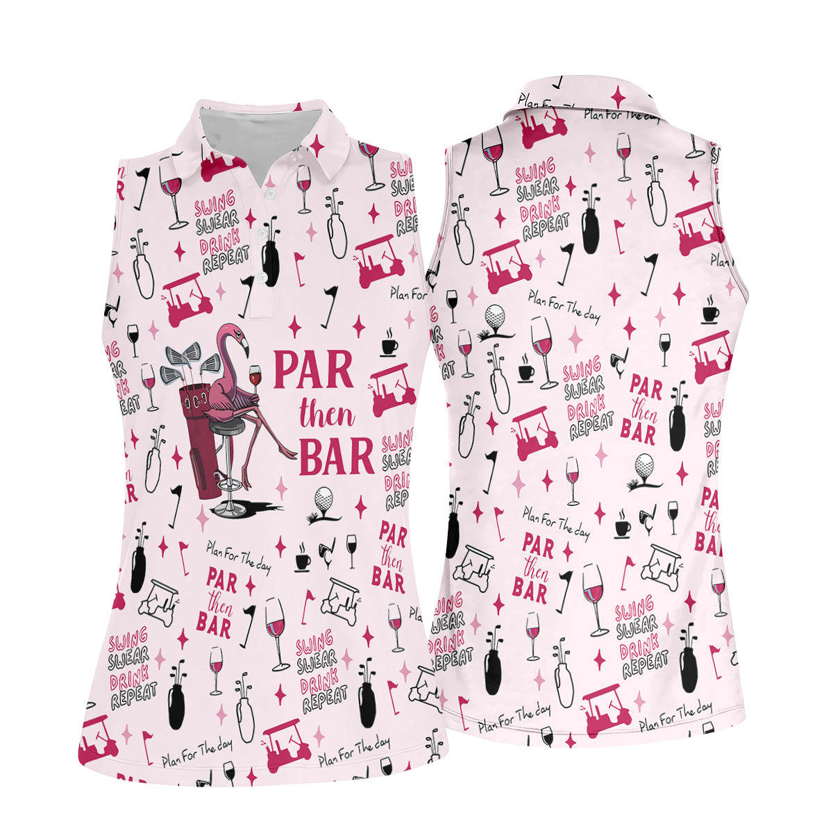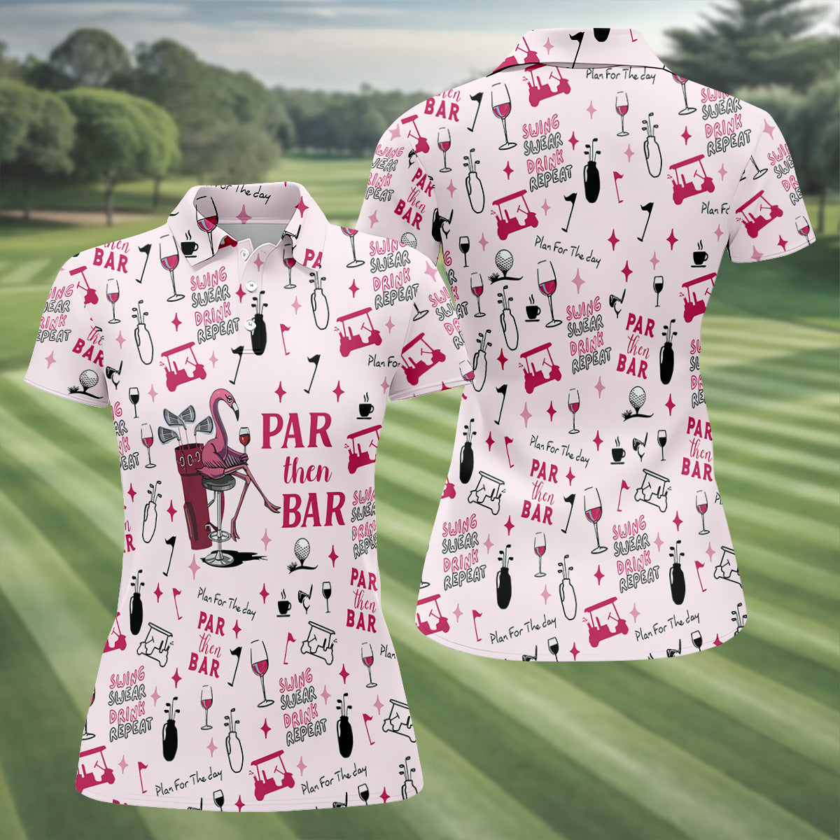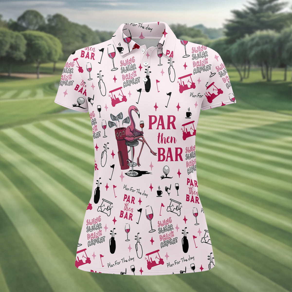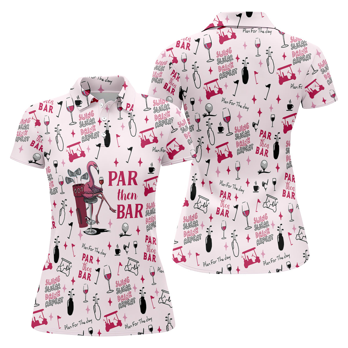 Pink Swing Swear Drink Repeat Par Then Bar Flamingo Golf Shirt, Fun Women's Golf Shirts, Ladies Golf Polos