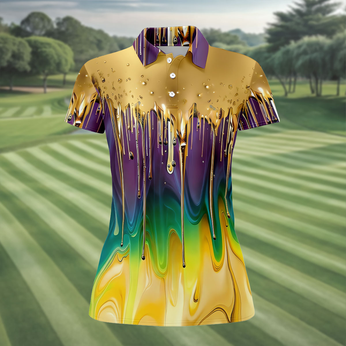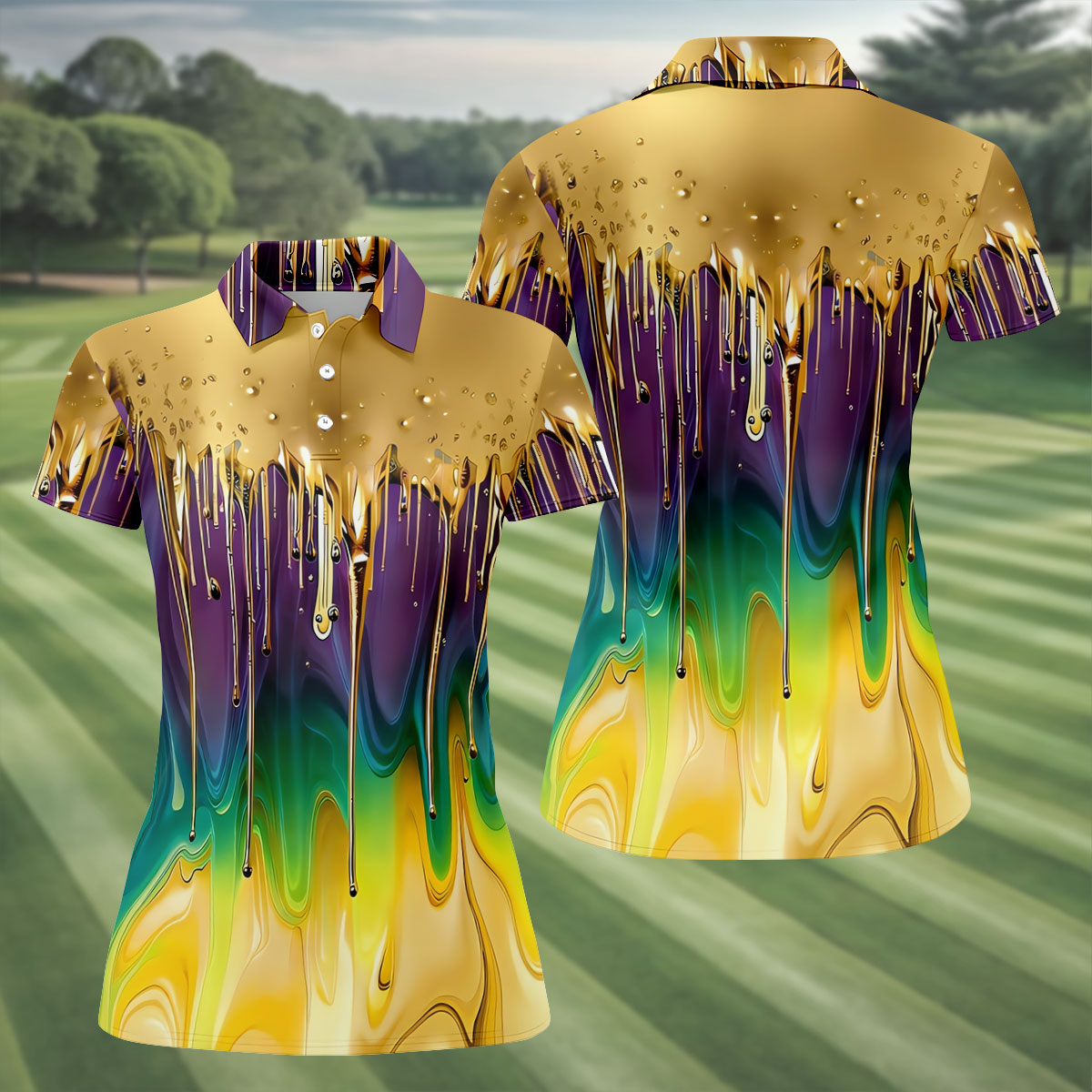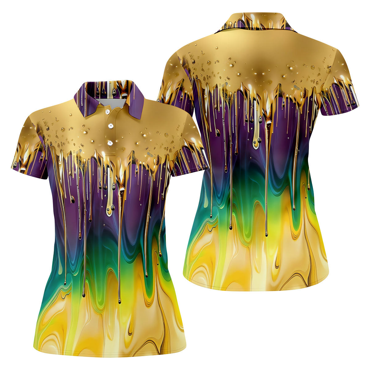 Purple Green Gold Dripping Effect Mardi Gras Golf Shirt, Women's Golf Shirts, Ladies Golf Polos