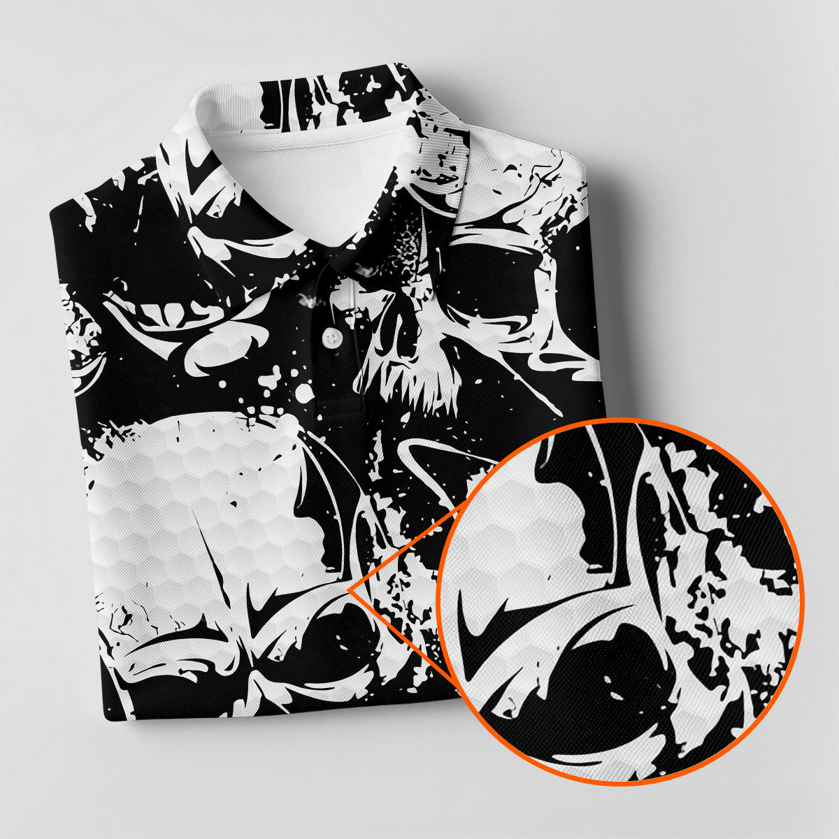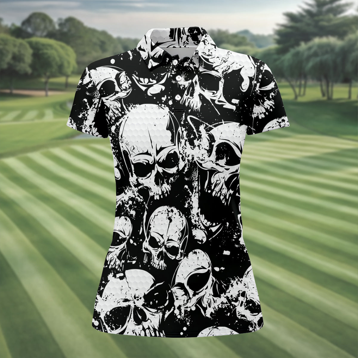 Meet the Skulls Splatter Black Grunge Womens Golf Shirts, Ladies Golf Polos, Cool Golf Gift, Golfing Apparel a shirt so bold it makes argyle cry in the corner. Designed for golfers who'd rather make a fashion statement than follow dress codes, this polo is your ticket to turning heads, raising eyebrows, and maybe distracting your buddies just enough to win a few holes. (We’re not saying it’s cheating... we’re saying it’s strategy.)