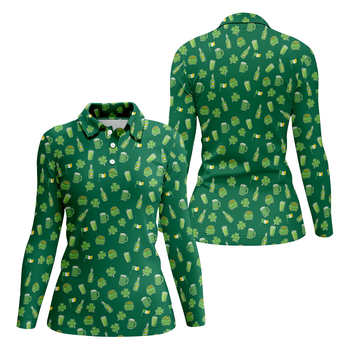 St Patrick's Day Beer Four Leaf Clovers Gold Pots Green Golf Shirt, Women's Golf Tops, Ladies Golf Polos