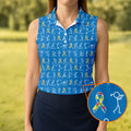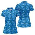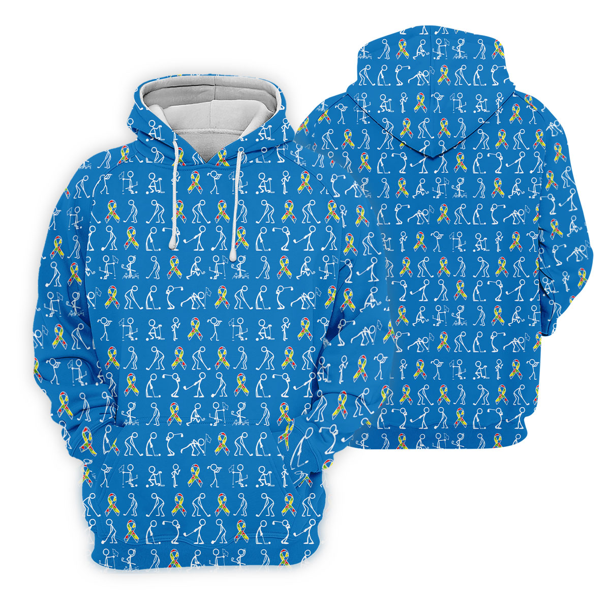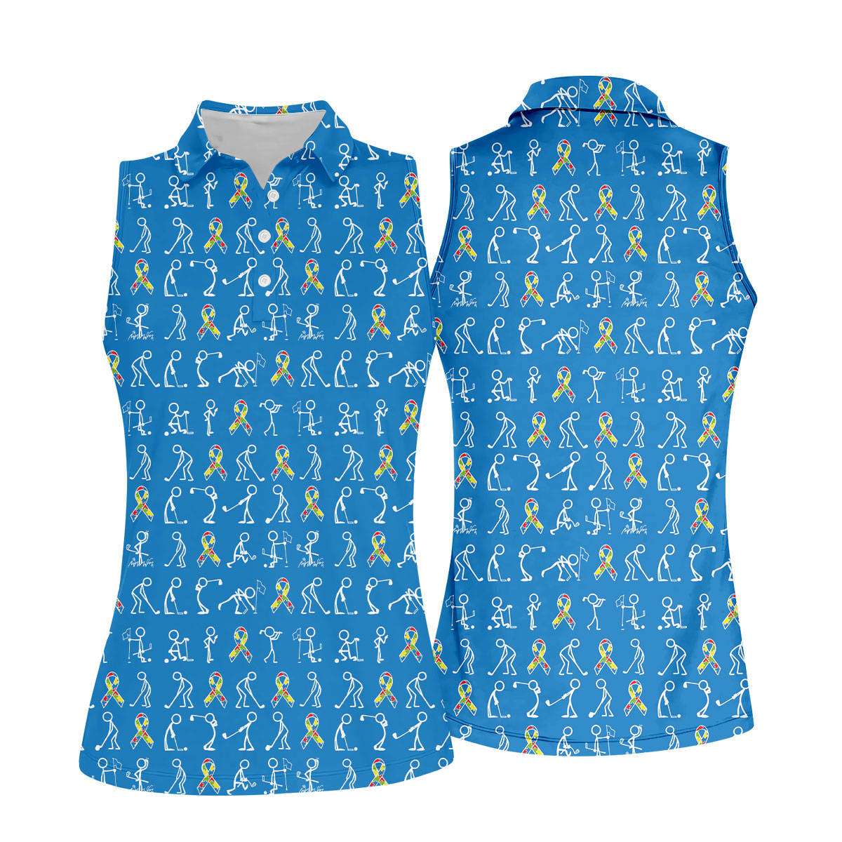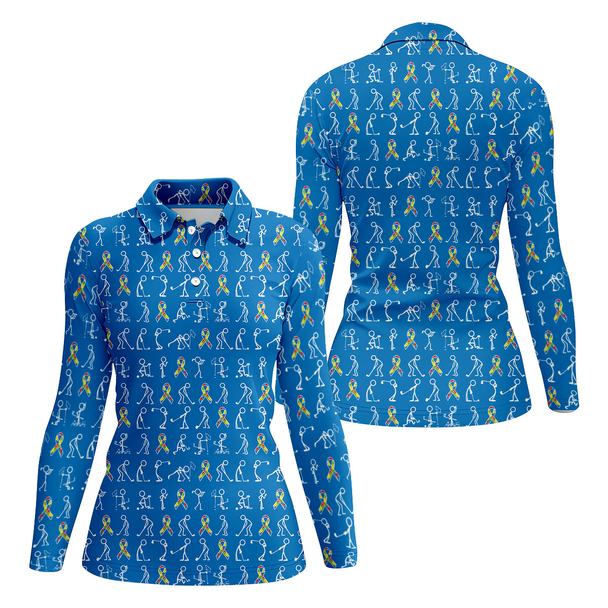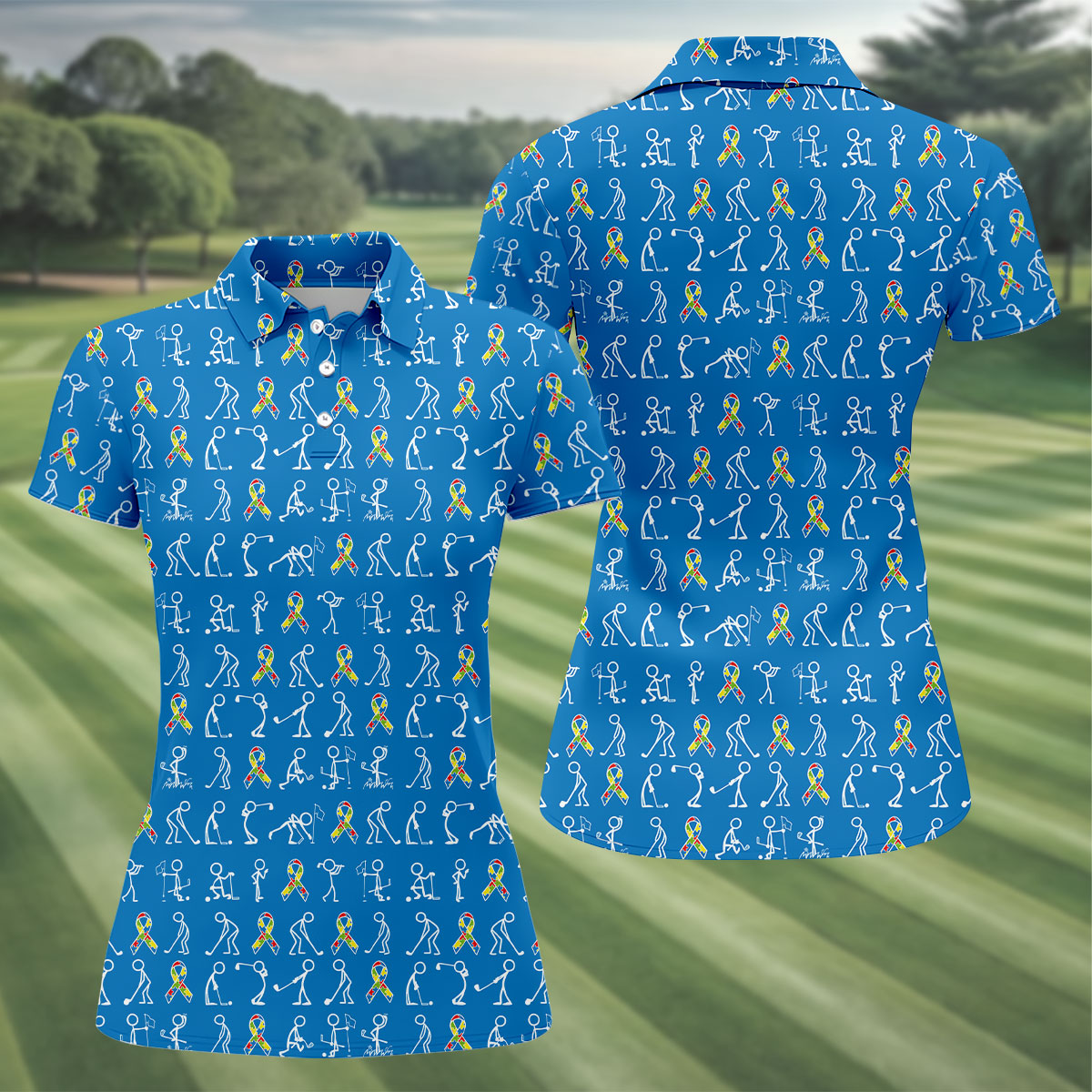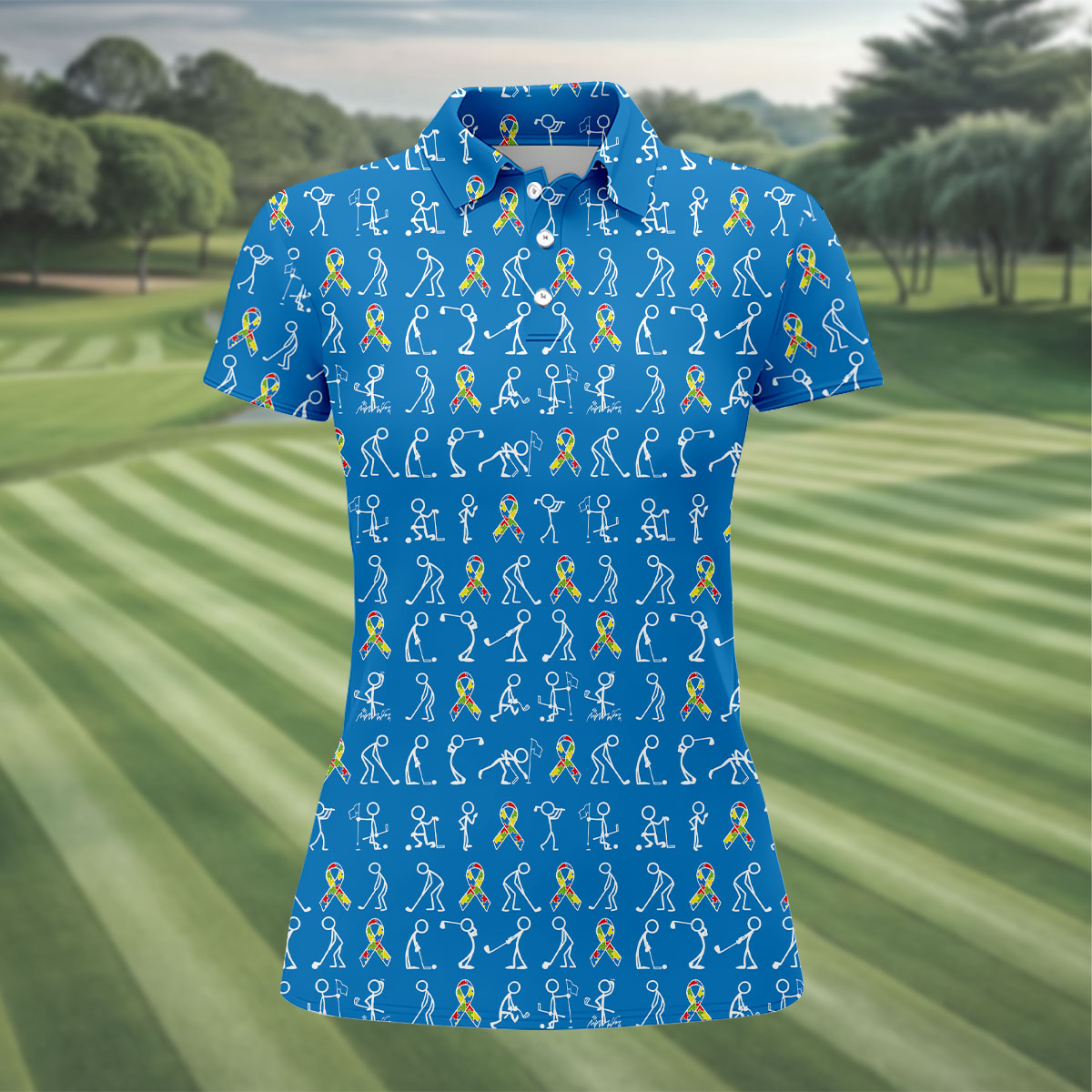 Stick Figure Golf Pose Autism Ribbon Blue Golf Shirt, Autism Awareness Colors Ladies Golf Polos