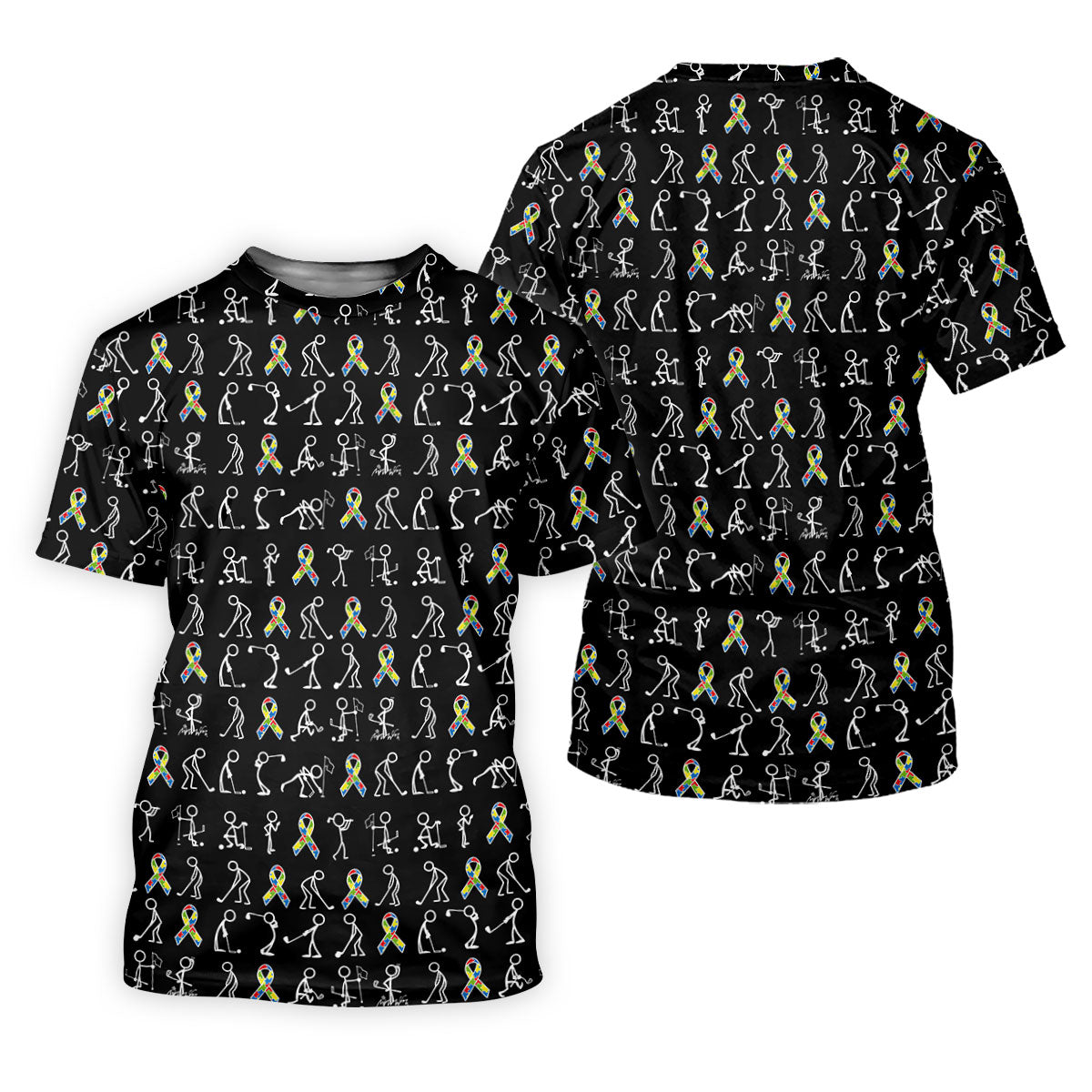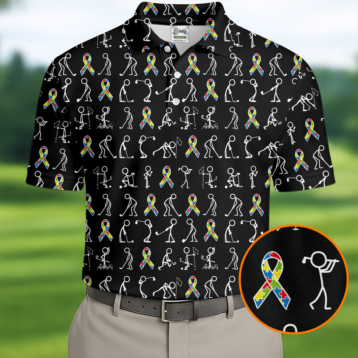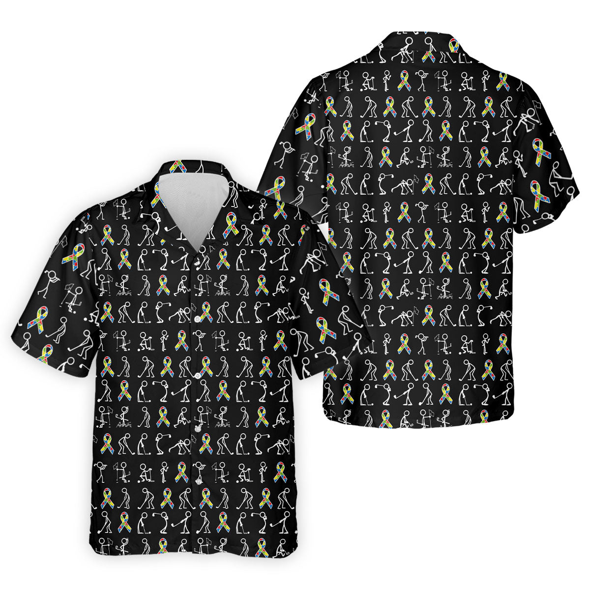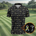 Stick Figure Golf Pose Autism Ribbon Black Golf Shirt, Autism Awareness Colors Golf Shirts For Men