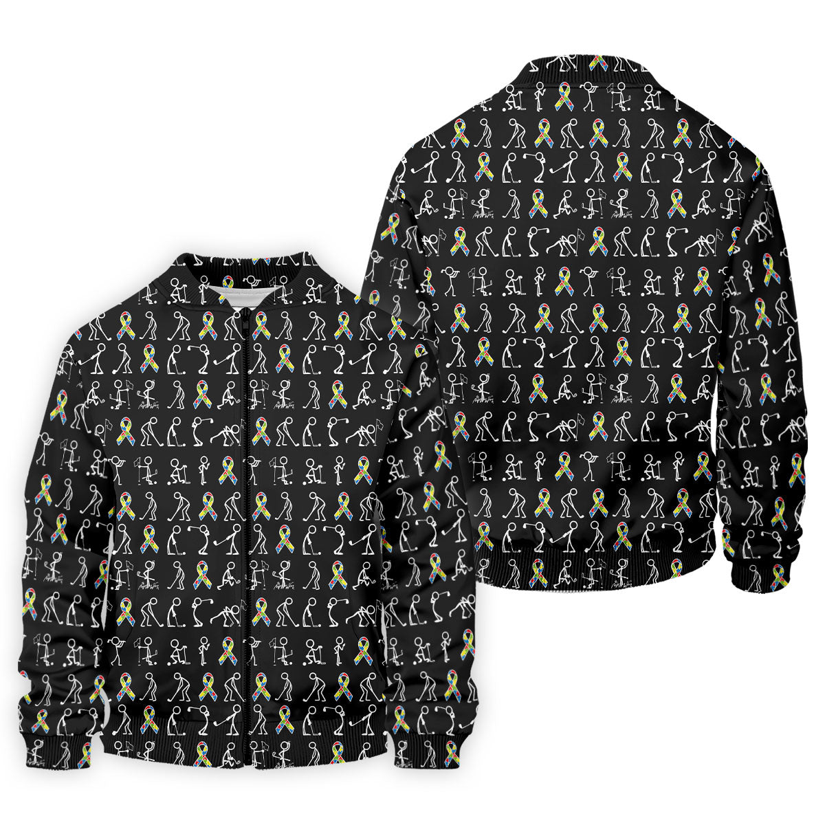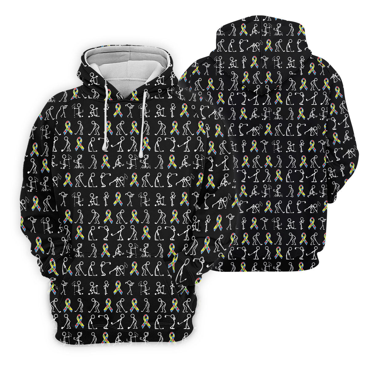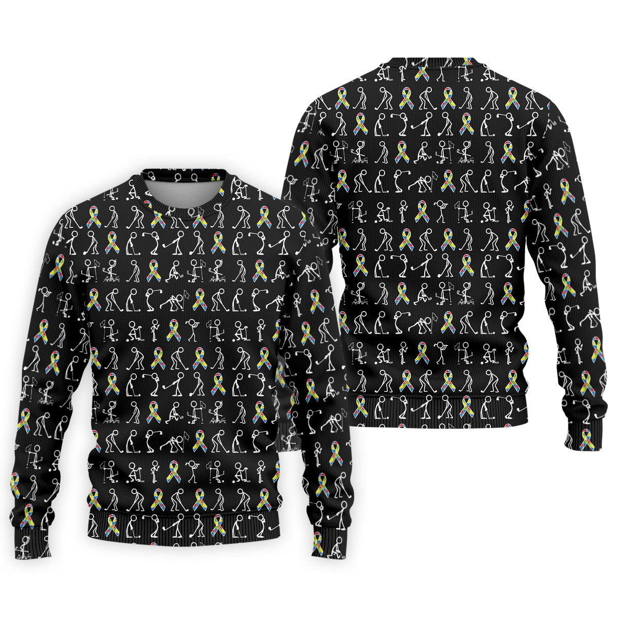 Stick Figure Golf Pose Autism Ribbon Black Golf Shirt, Autism Awareness Colors Golf Shirts For Men