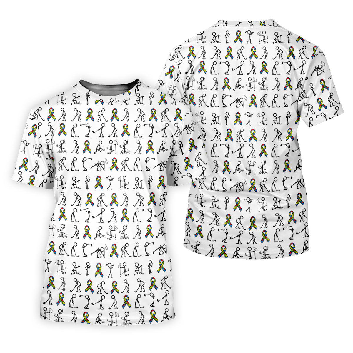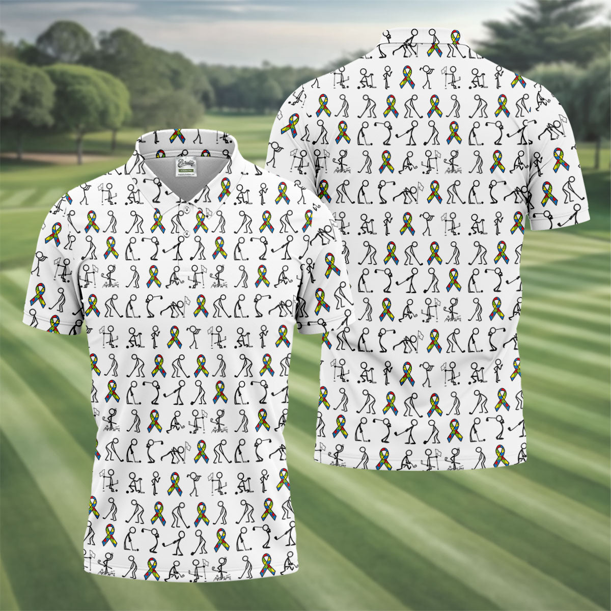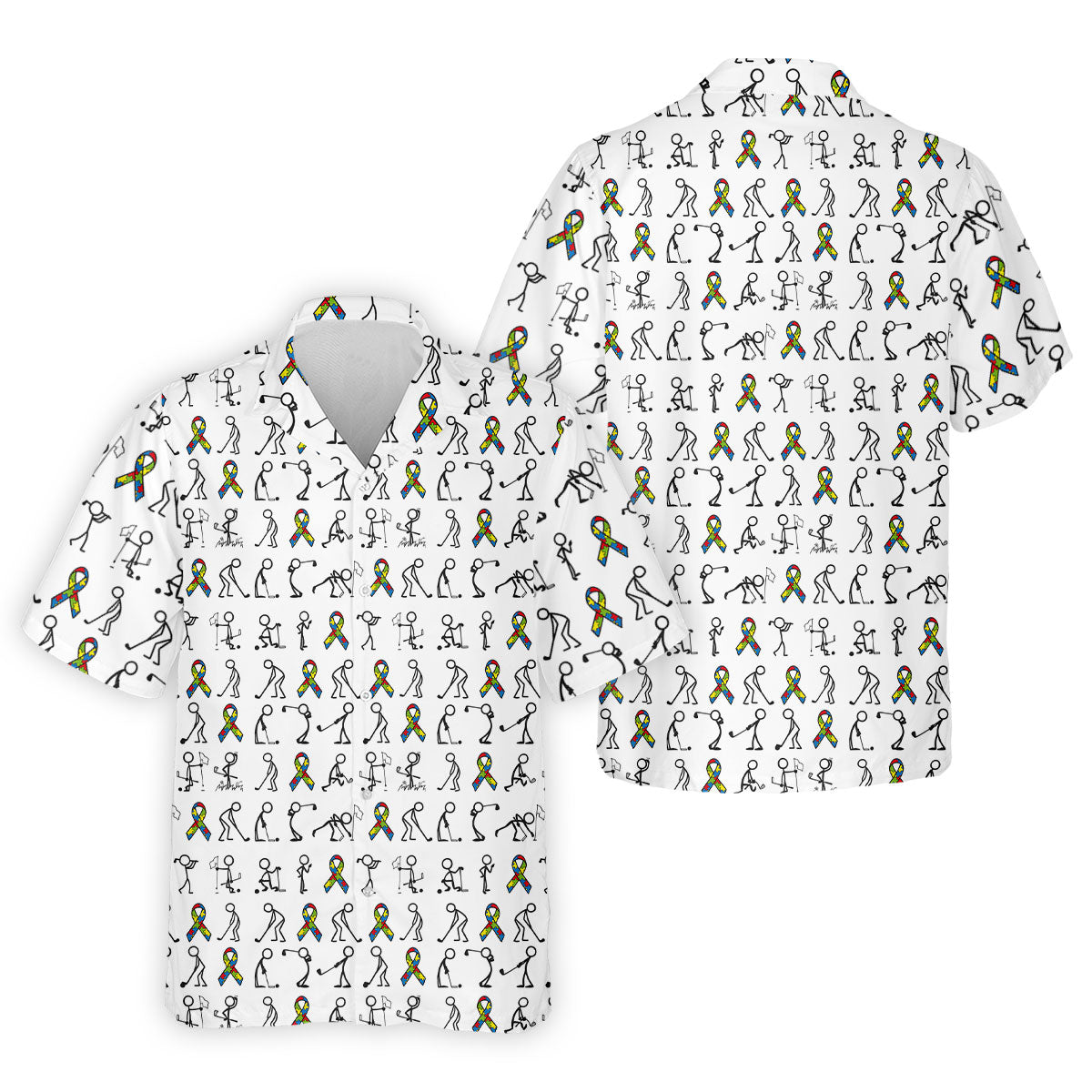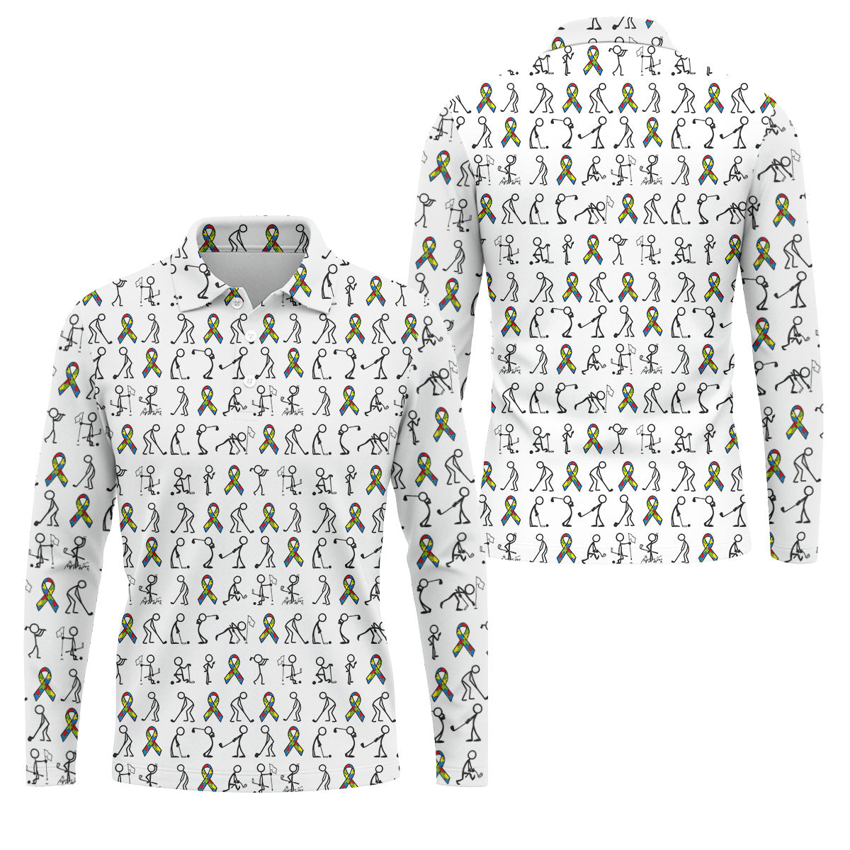 Stick Figure Golf Pose Autism Ribbon White Golf Shirt, Autism Awareness Colors Golf Shirts For Men