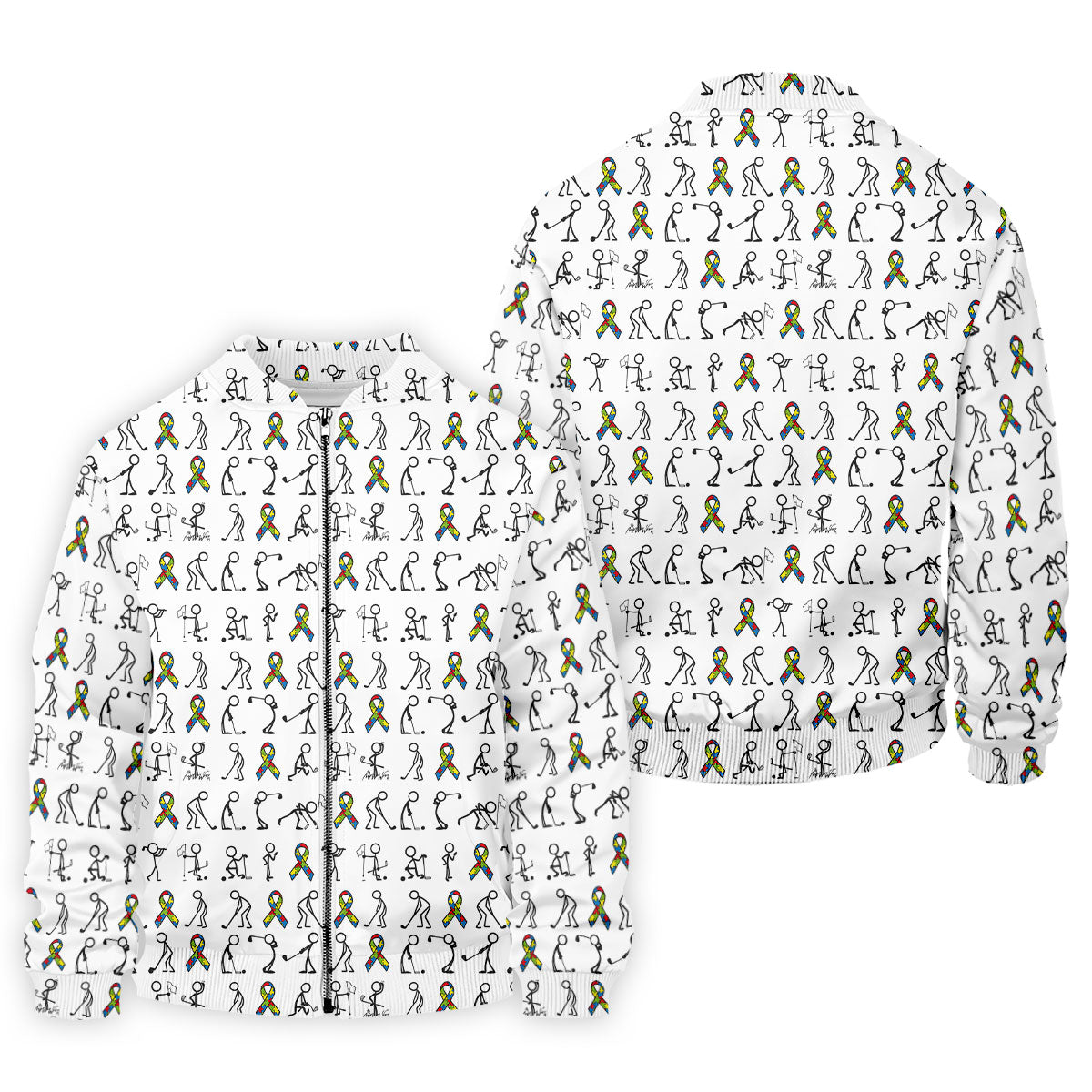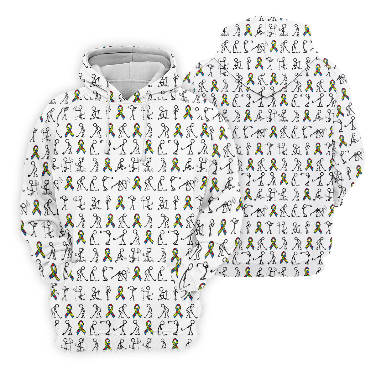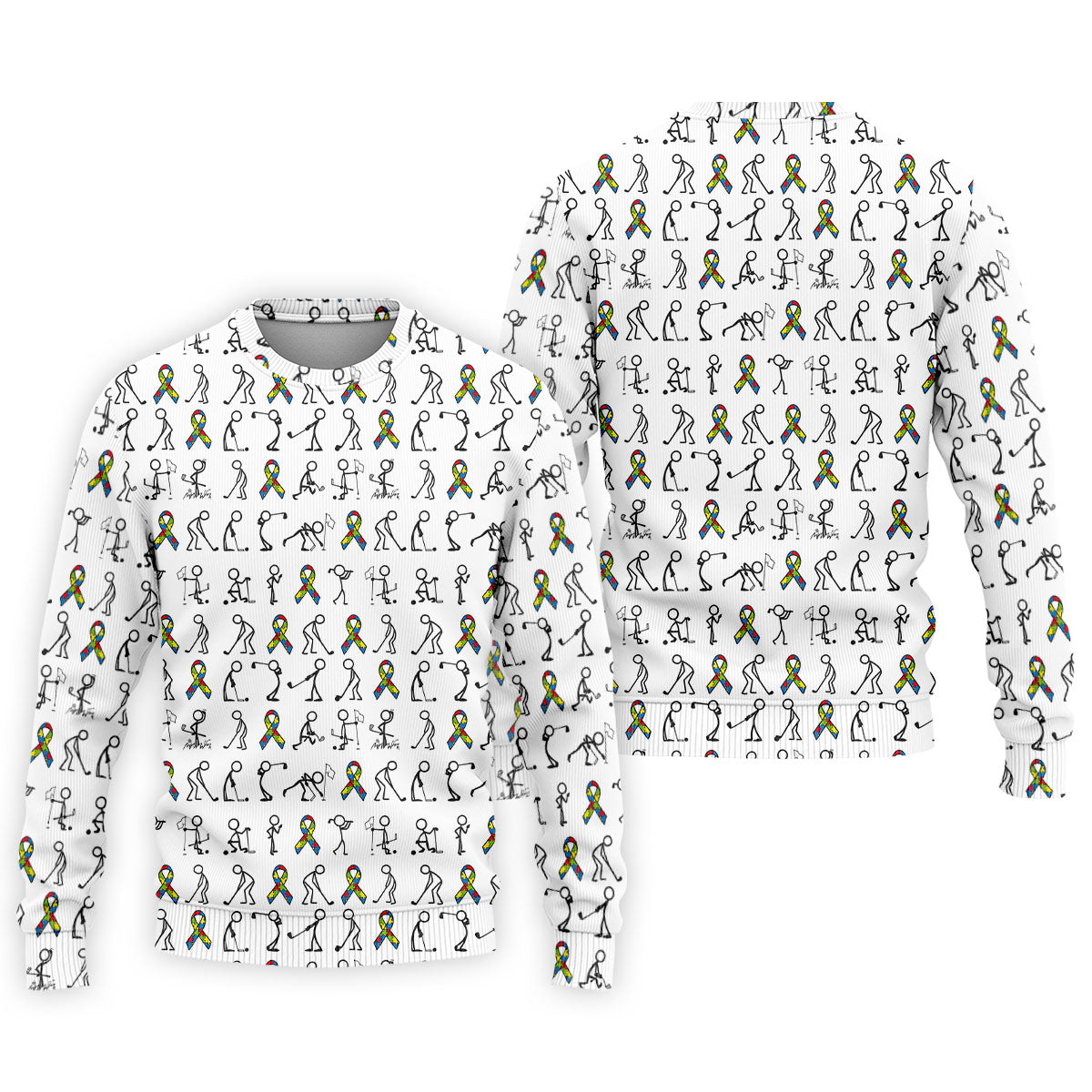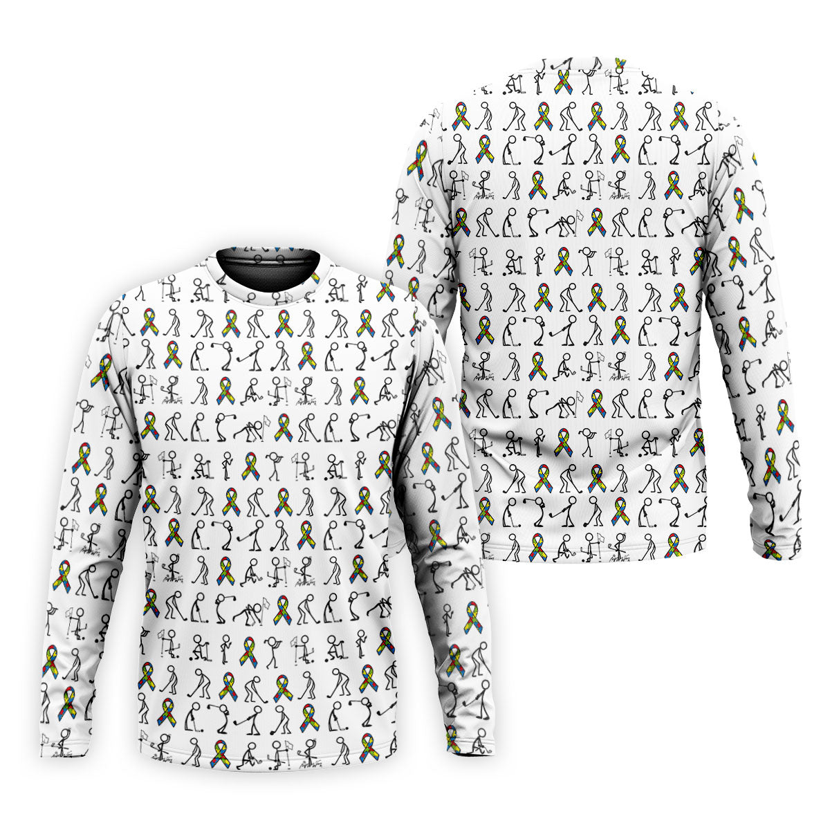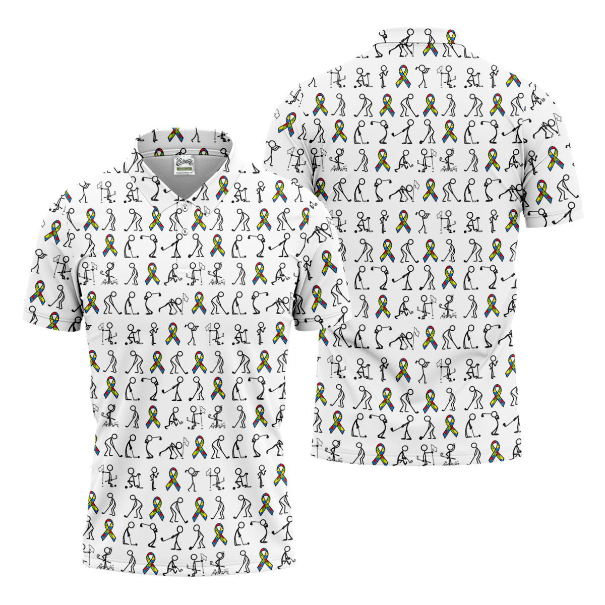 Stick Figure Golf Pose Autism Ribbon White Golf Shirt, Autism Awareness Colors Golf Shirts For Men