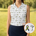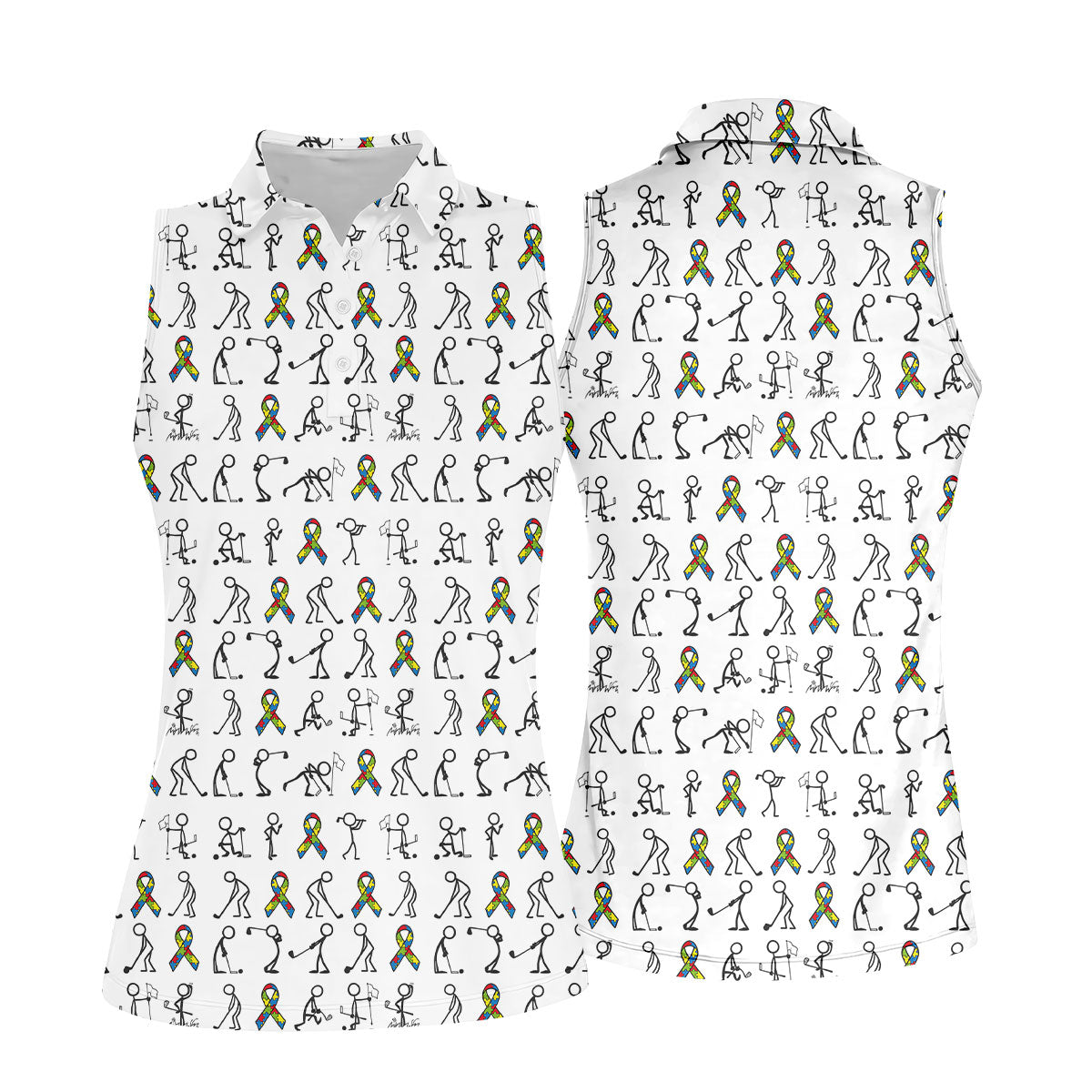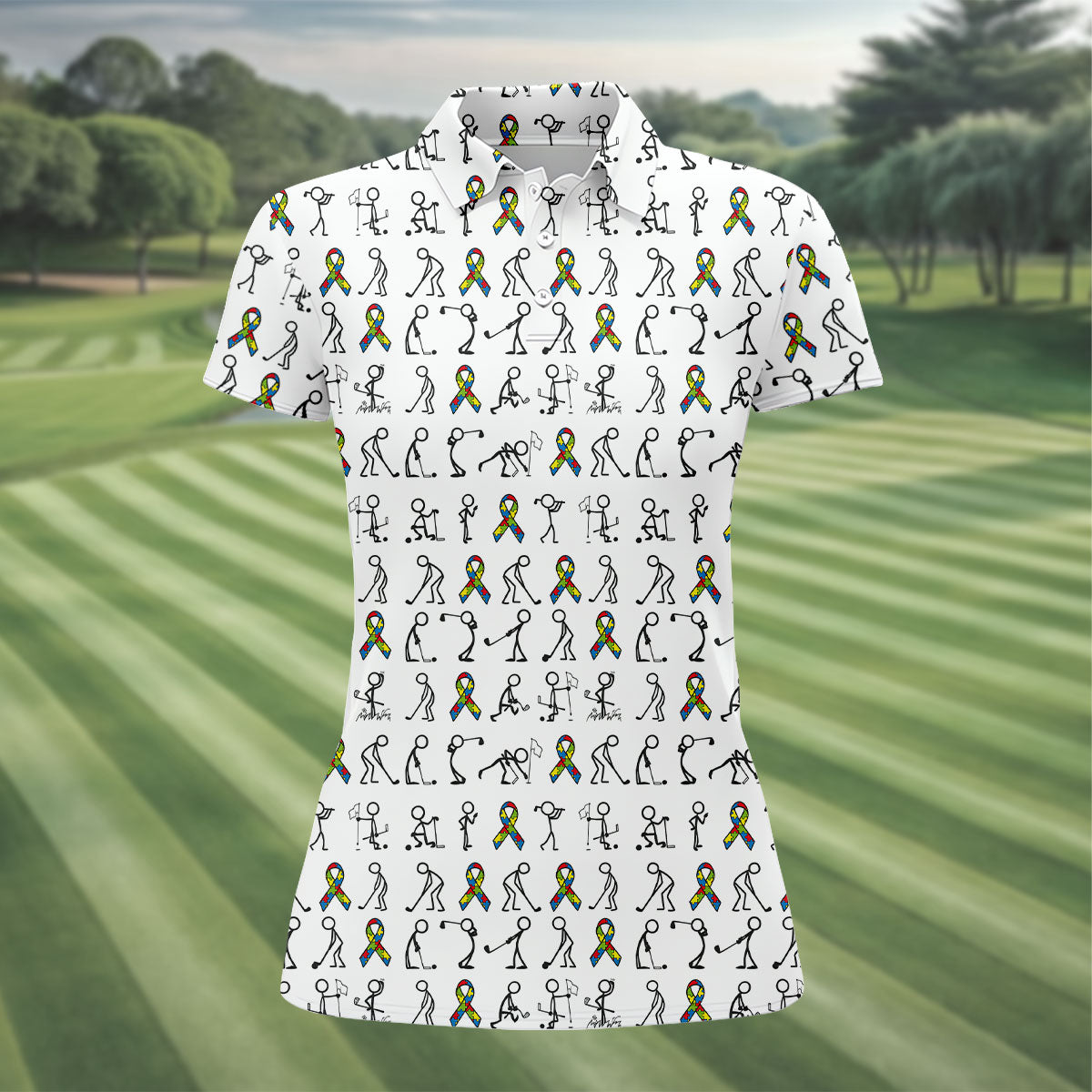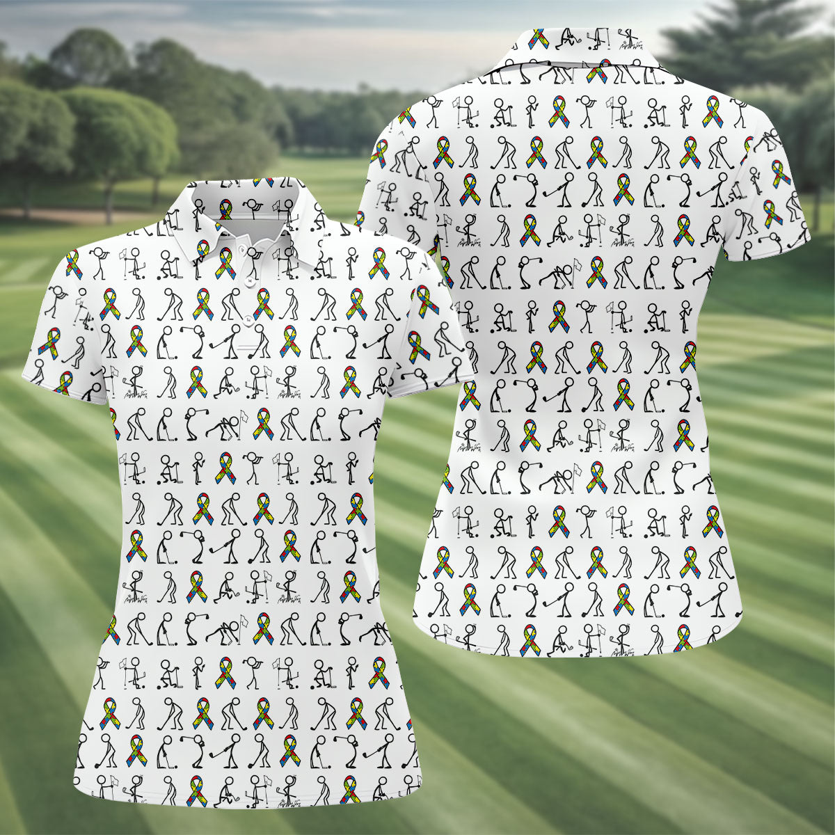Stick Figure Golf Pose Autism Ribbon White Golf Shirt, Autism Awareness Colors Ladies Golf Polos