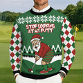 Introducing the Stop Looking At My Putt Funny Santa Christmas Ugly Sweater, Golf Ugly Christmas Sweater, Christmas Golf Shirt, where bad shots meet good vibes and Christmas spirit takes a full swing.