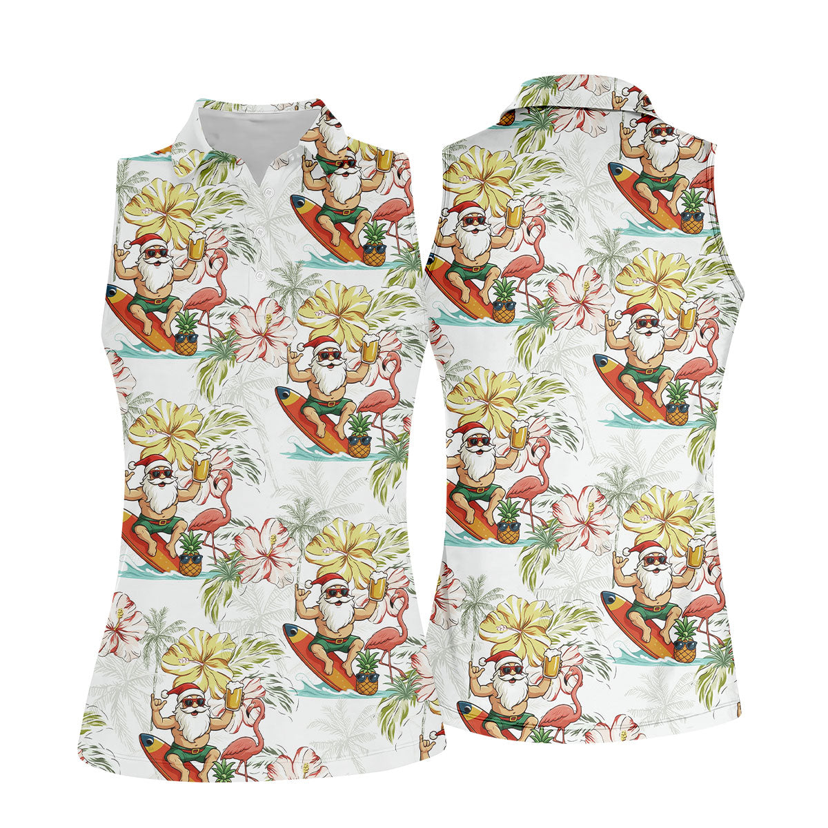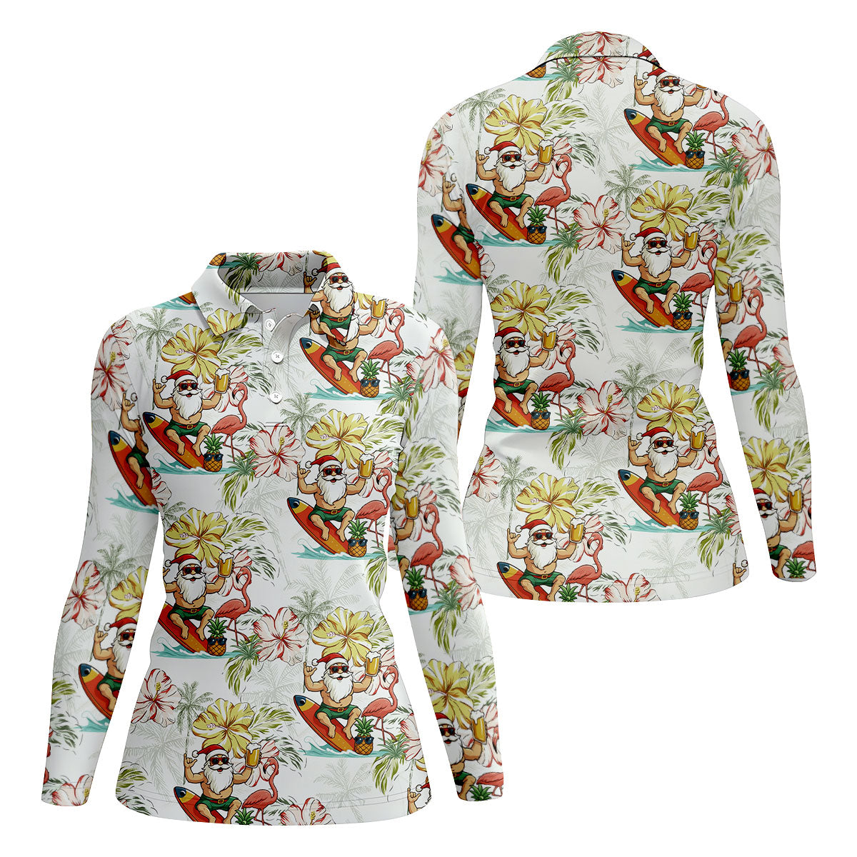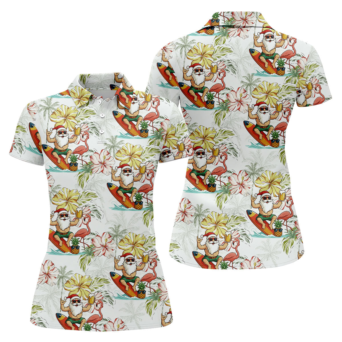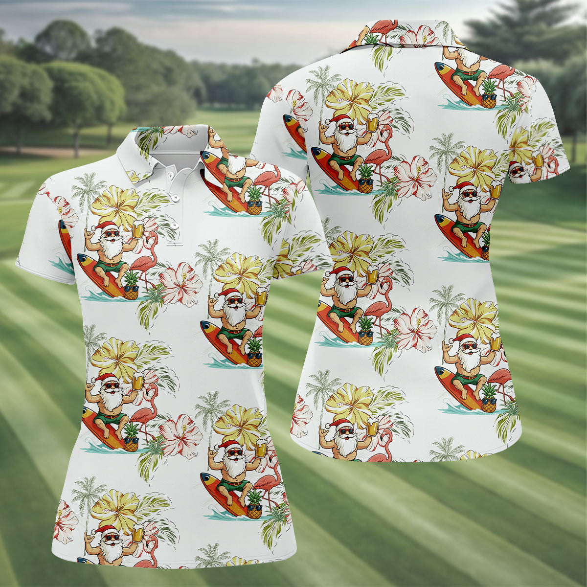 Surfing Santa Hawaiian Golf Shirt, Fun Women's Golf Shirts, Christmas In July Golf Gifts For Women