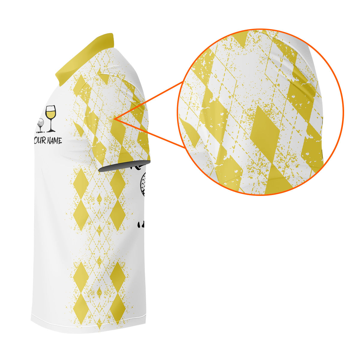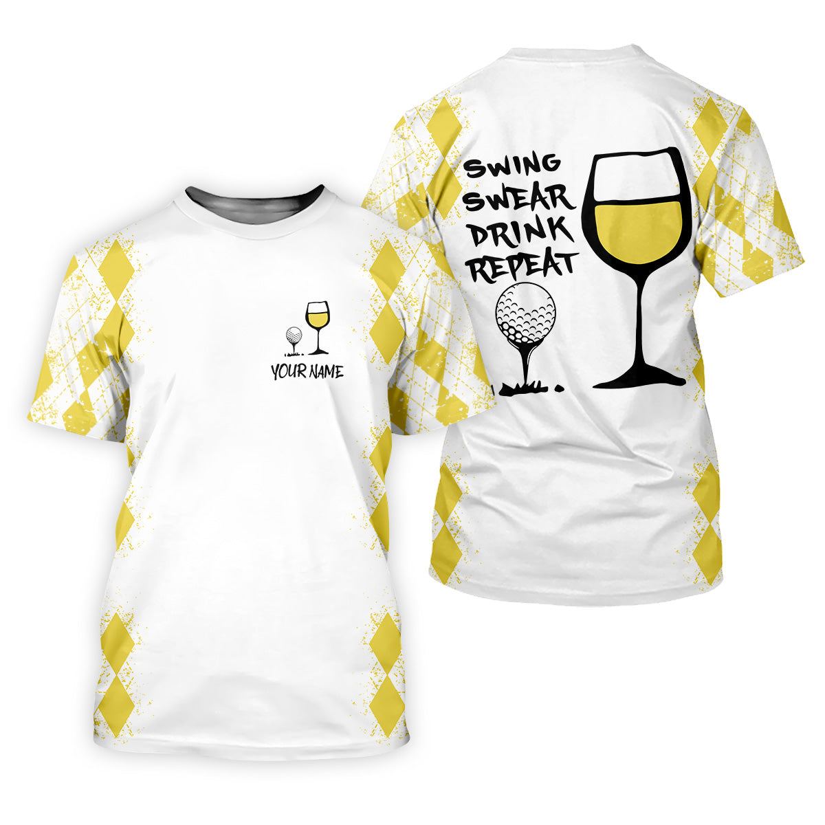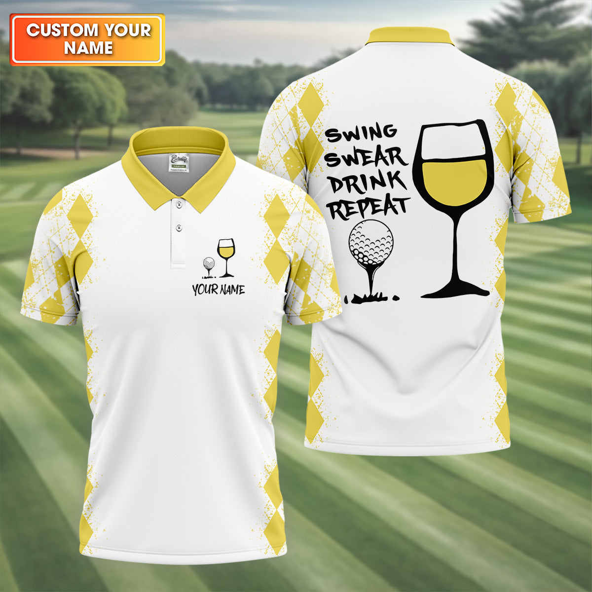 Swing Swear Drink Repeat Lemon Yellow Argyle Golf Shirt, Fun Golf Shirts For Men, Men's White Polo