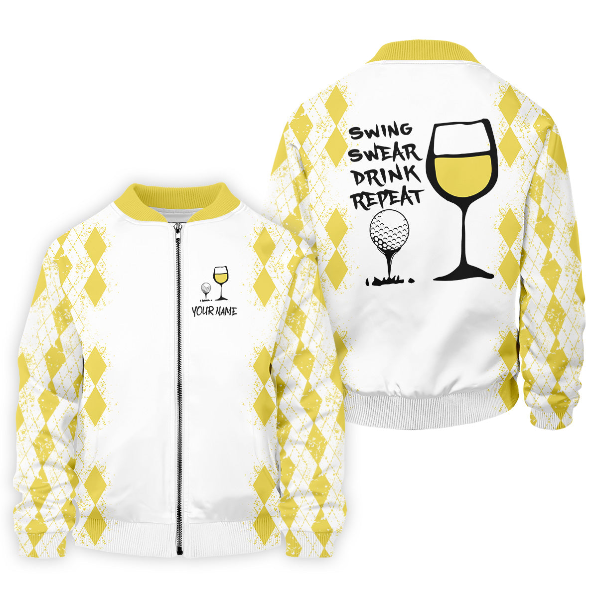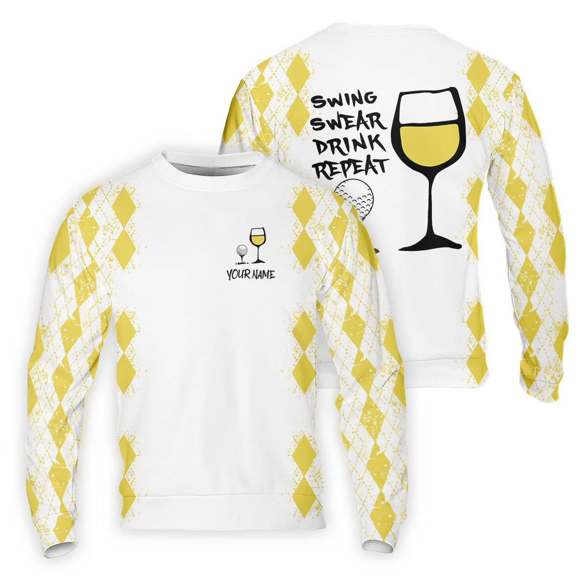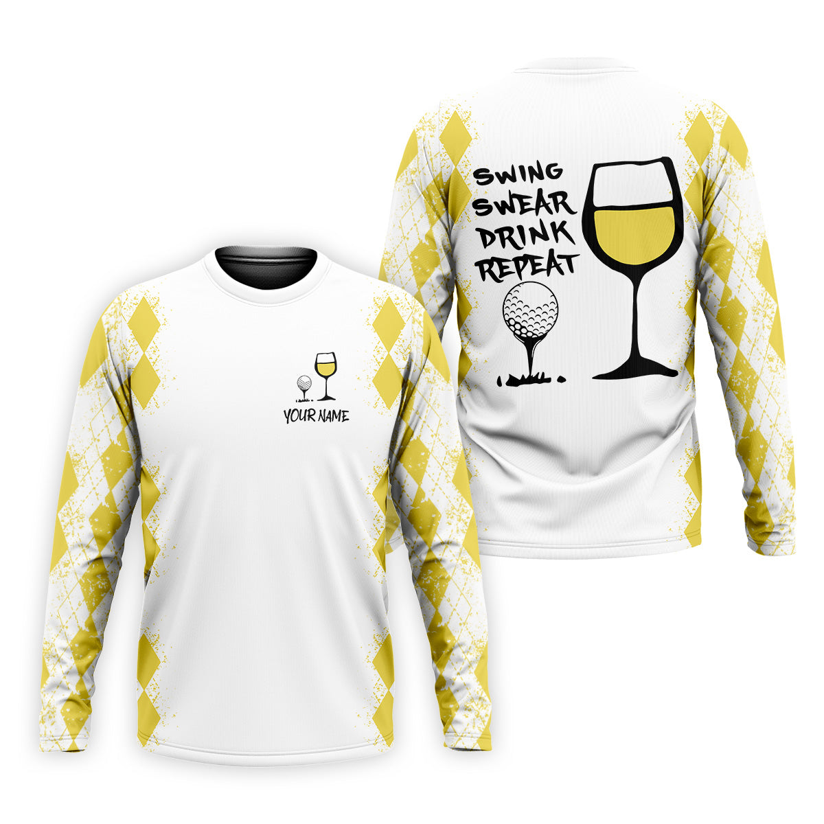 Swing Swear Drink Repeat Lemon Yellow Argyle Golf Shirt, Fun Golf Shirts For Men, Men's White Polo