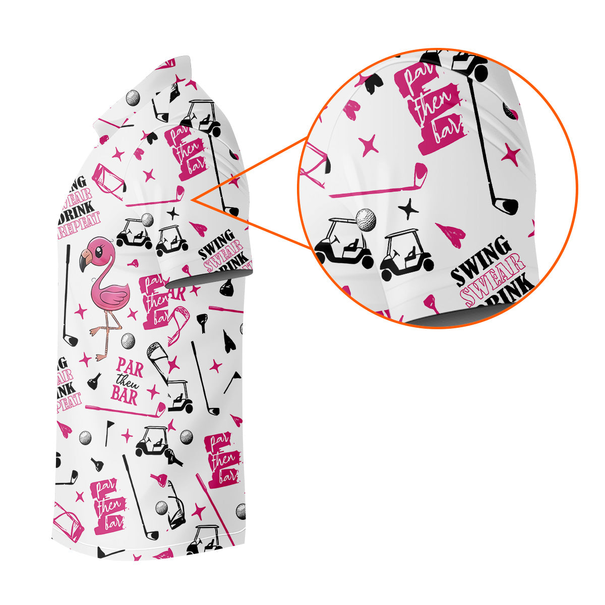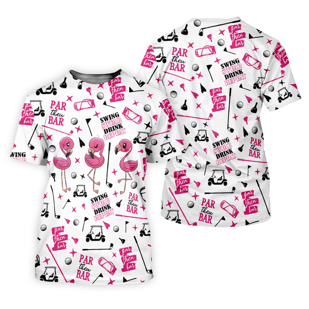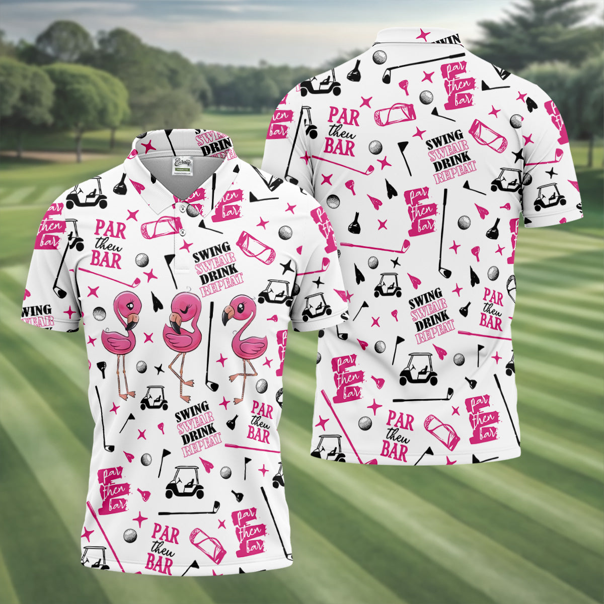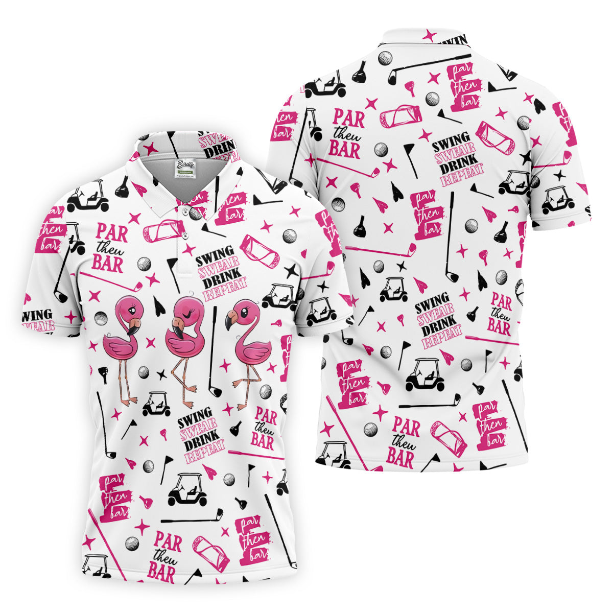 Swing Swear Drink Repeat Par Then Bar Flamingo Golf Shirt, Pink And White Fun Golf Shirts For Men