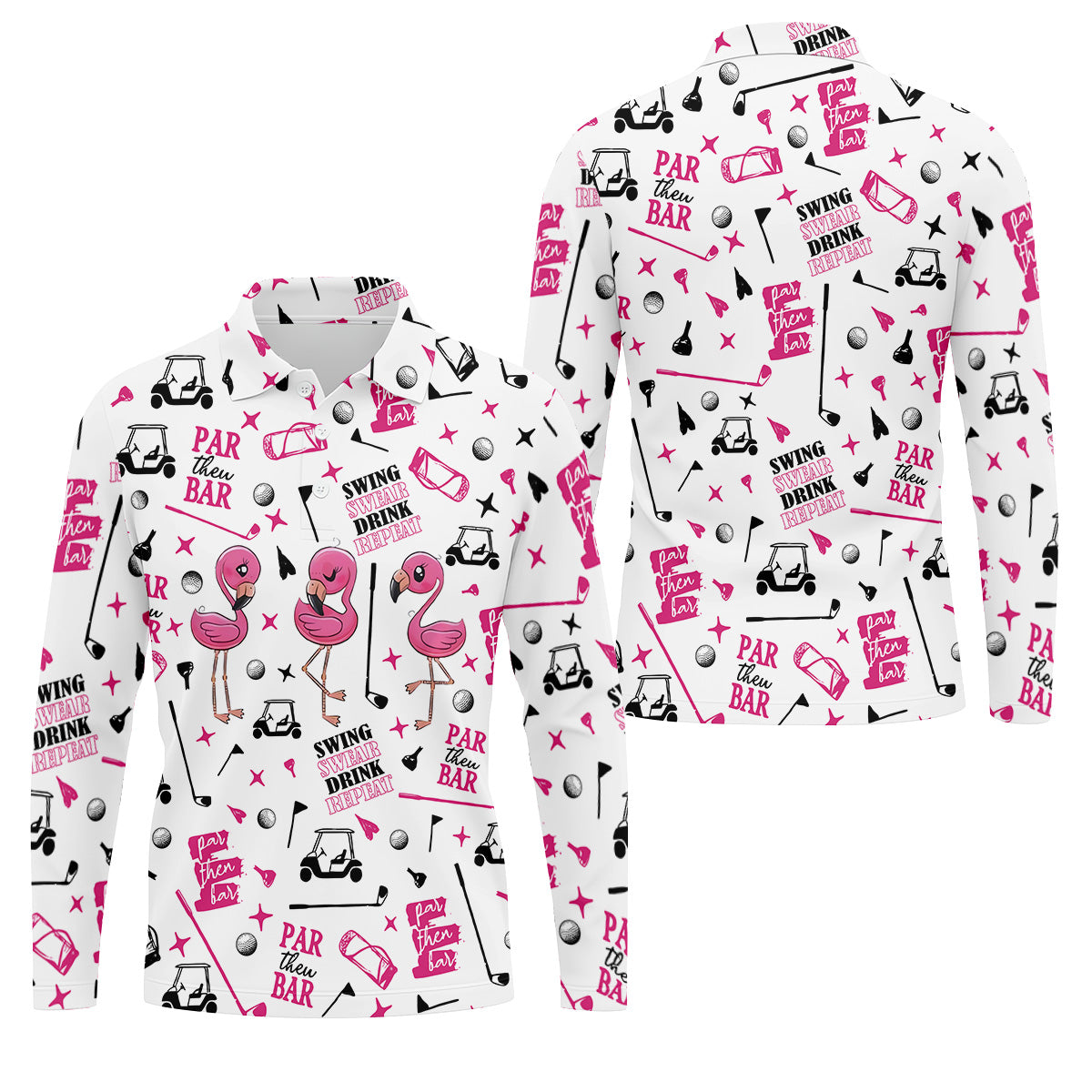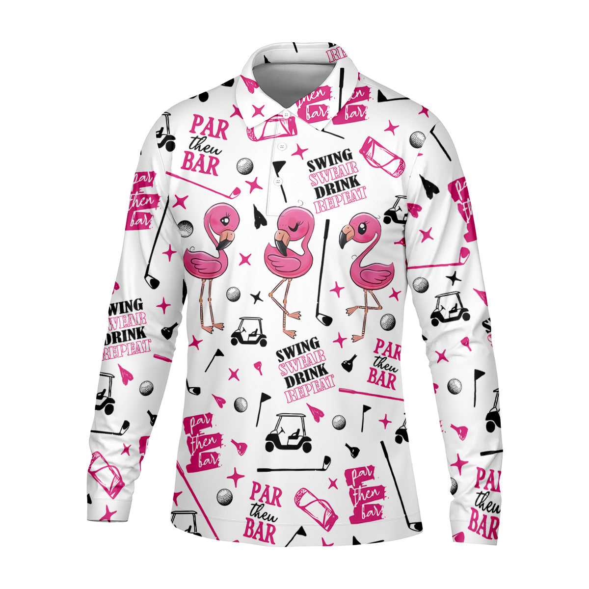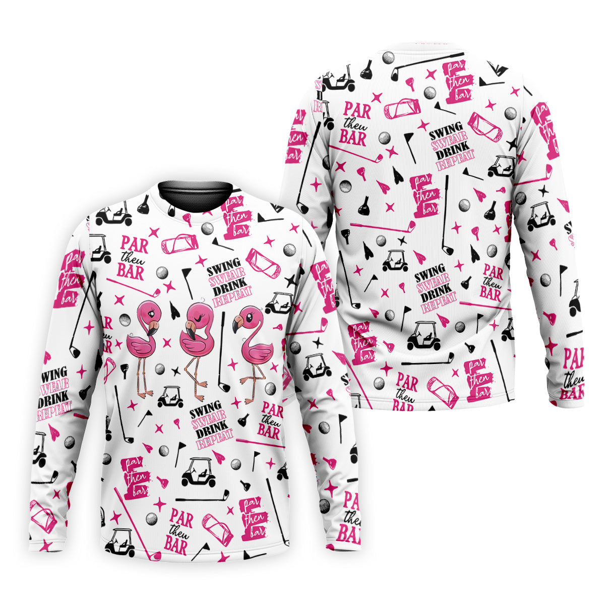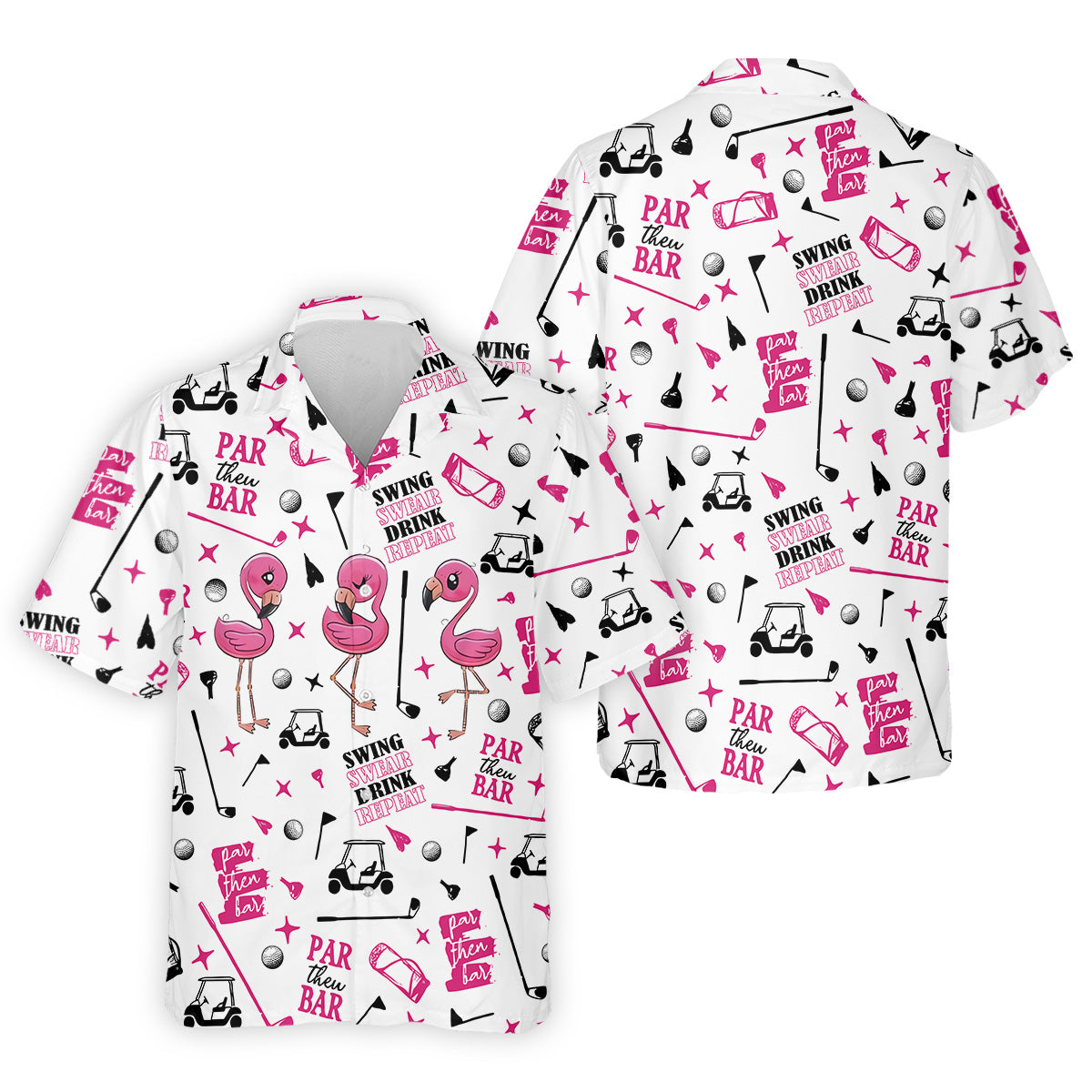 Swing Swear Drink Repeat Par Then Bar Flamingo Golf Shirt, Pink And White Fun Golf Shirts For Men