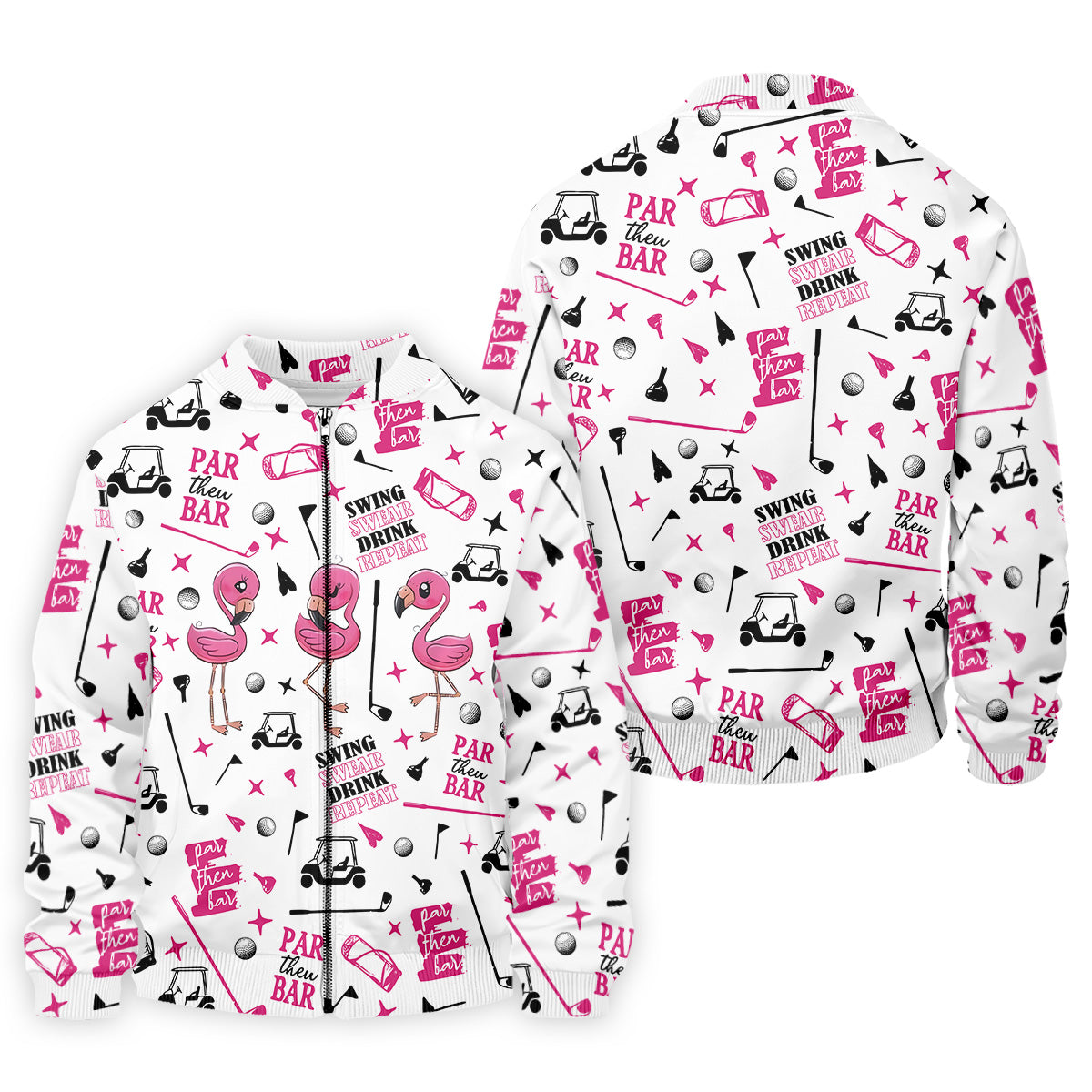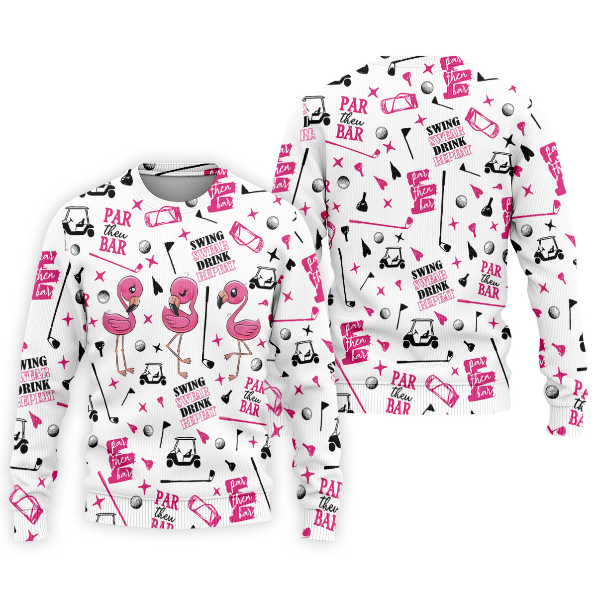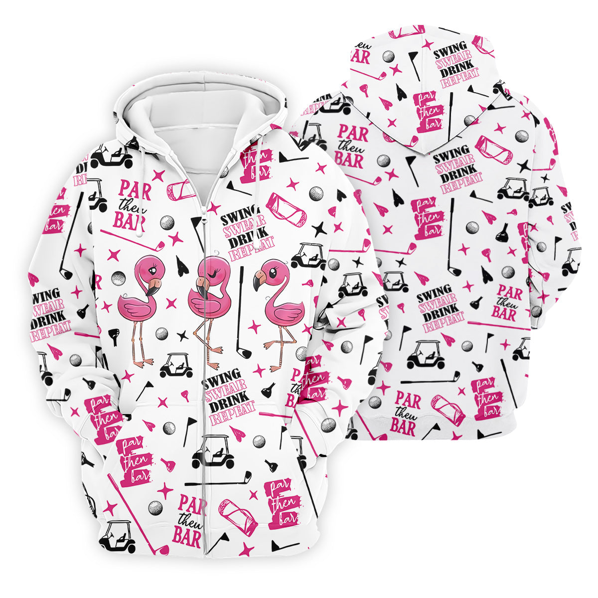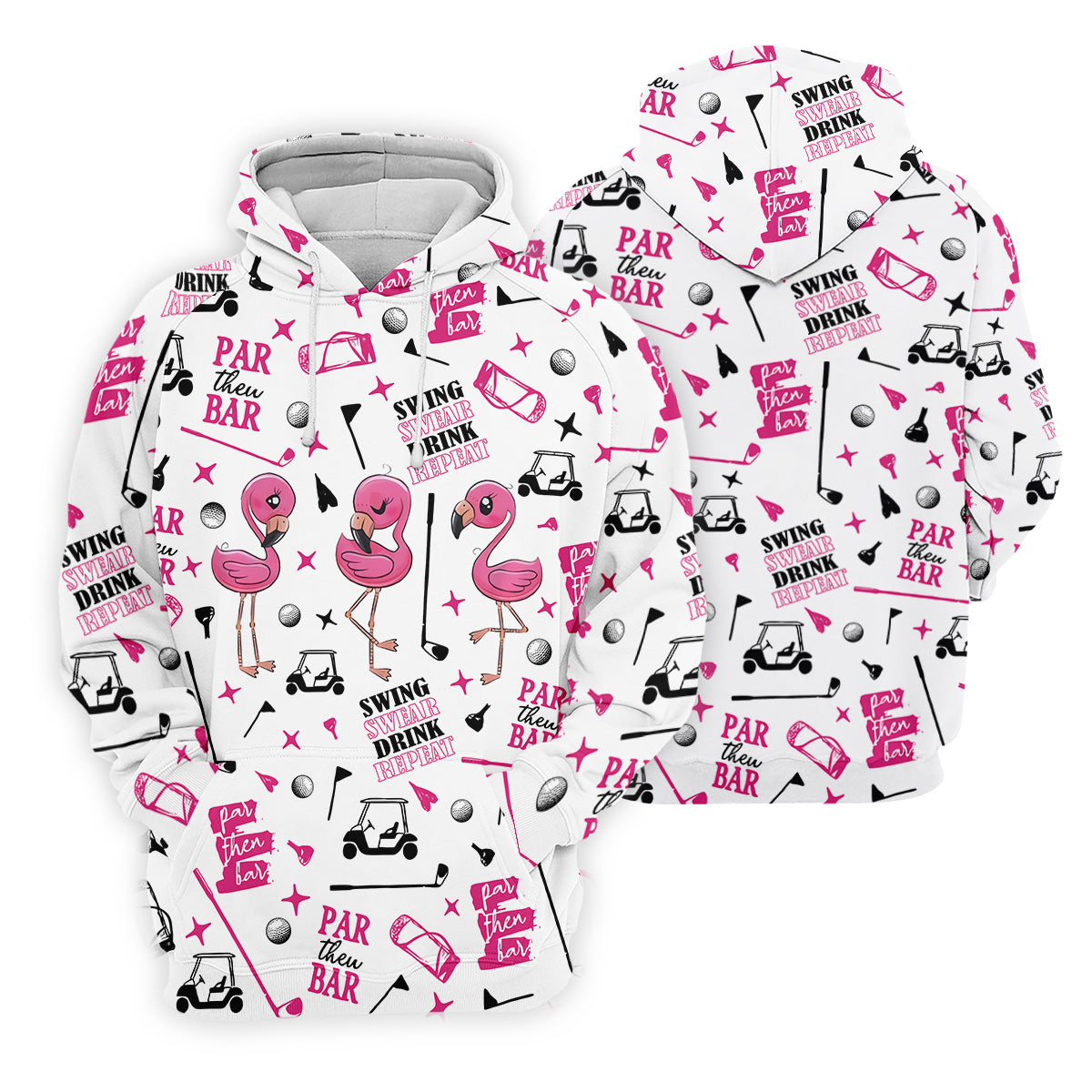 Swing Swear Drink Repeat Par Then Bar Flamingo Golf Shirt, Pink And White Fun Golf Shirts For Men