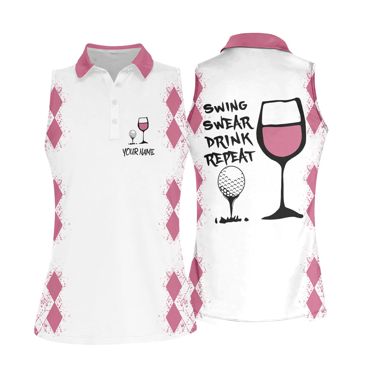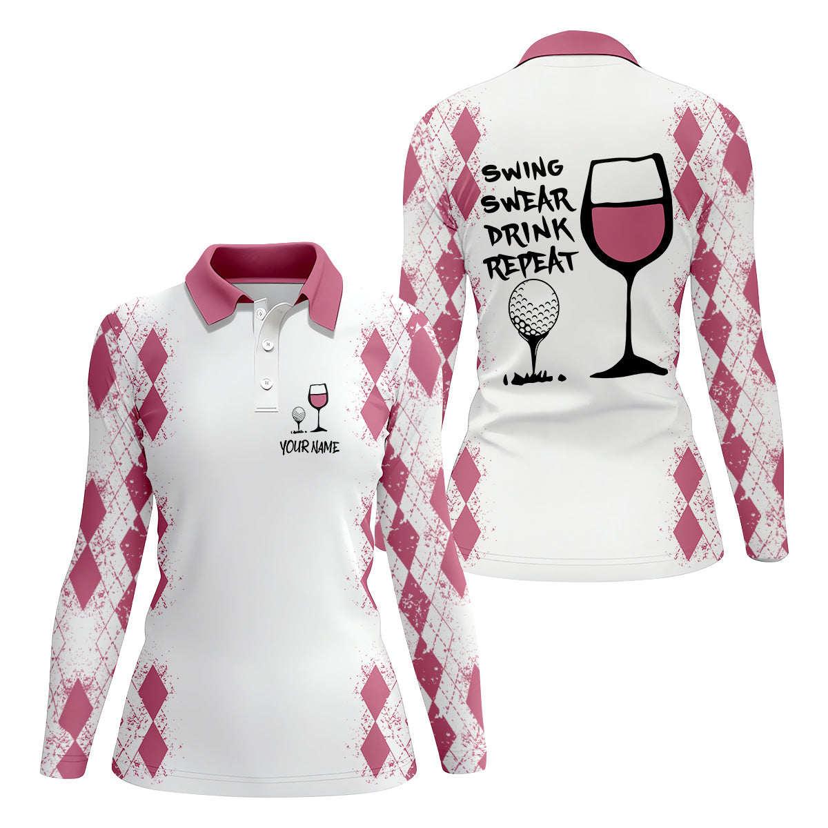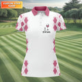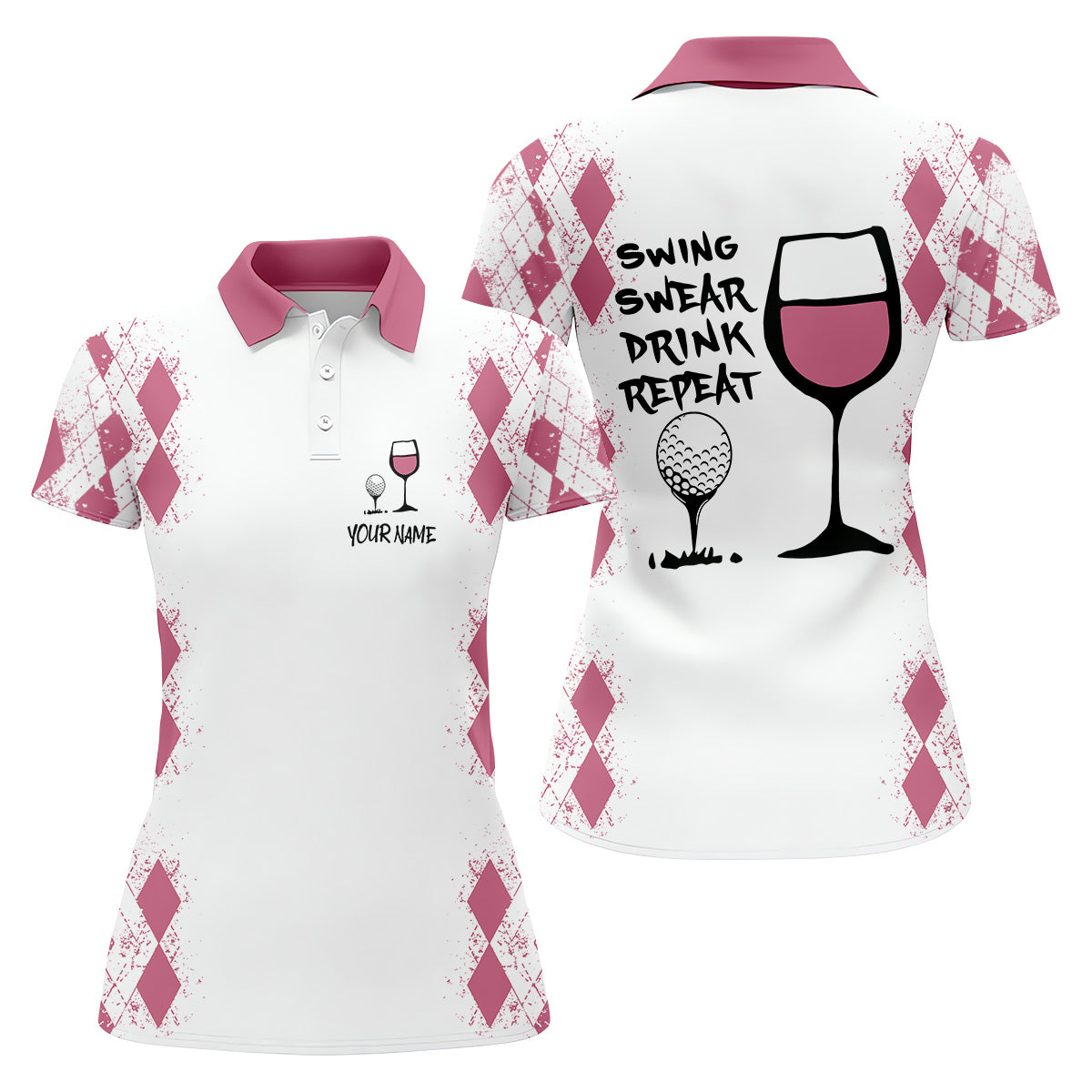 Swing Swear Drink Repeat Pink Argyle Golf Shirt, Fun Womens Golf Shirts, White Polo Women, Ladies Golf Shirts