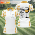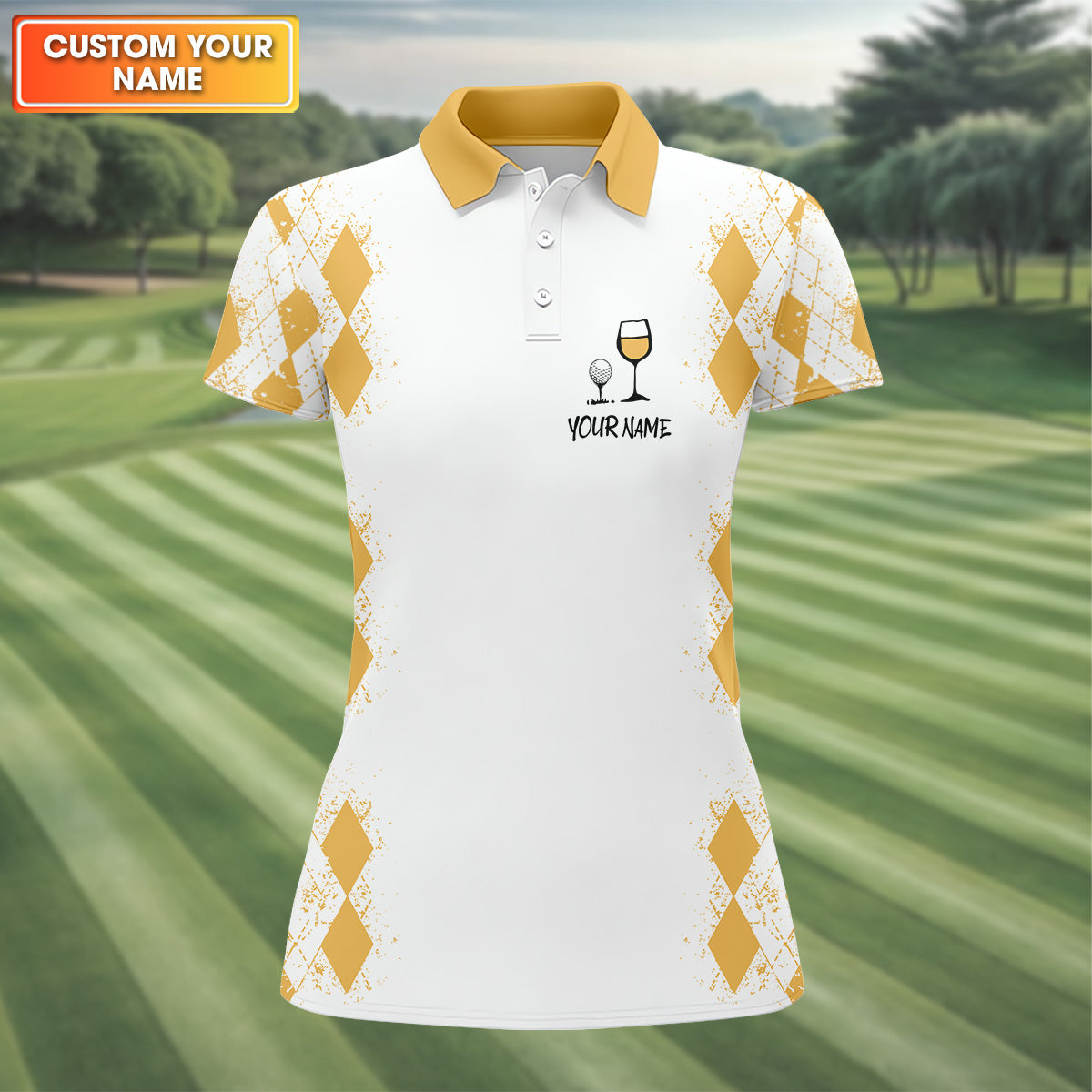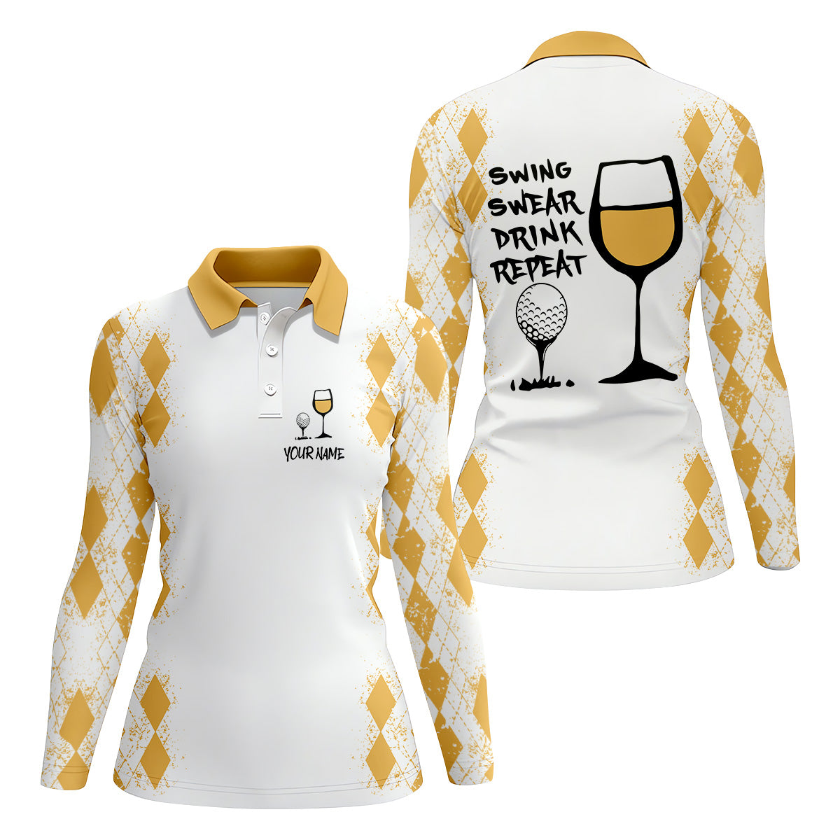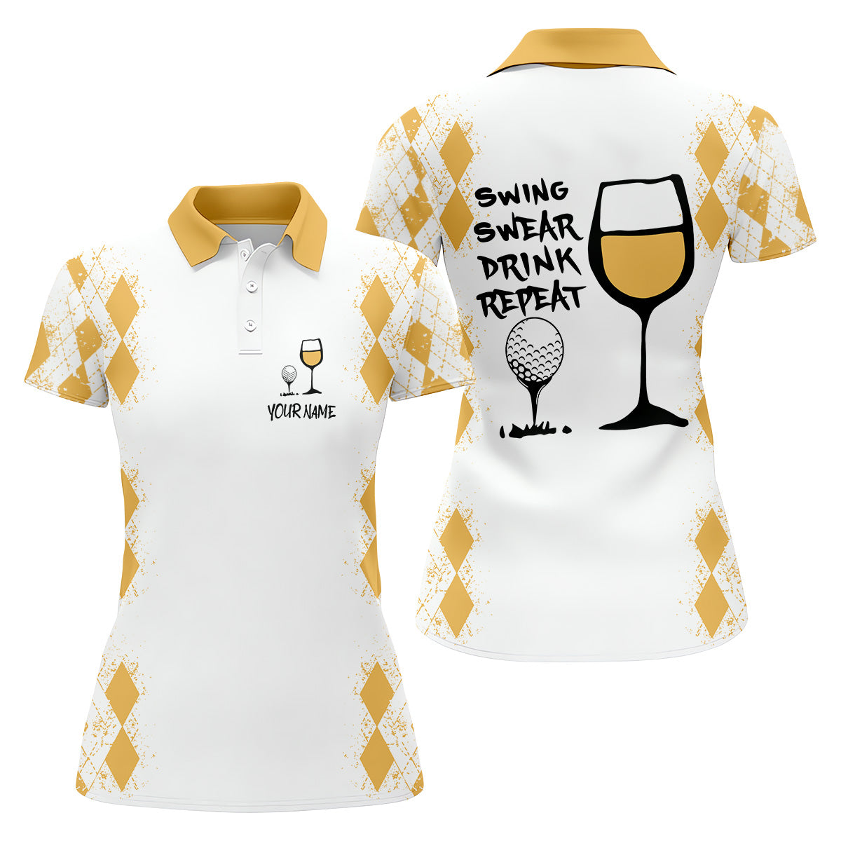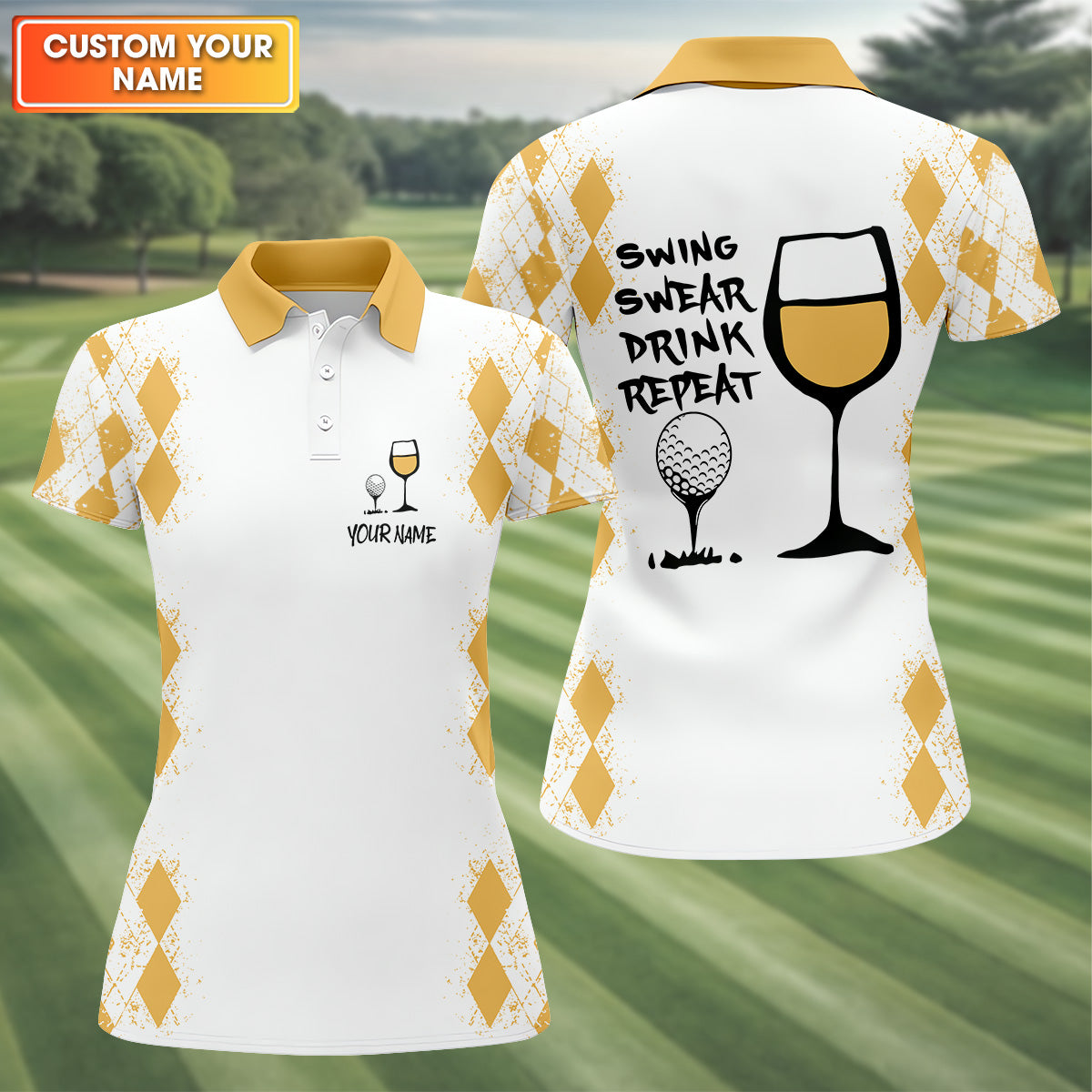 Swing Swear Drink Repeat Yellow Argyle Golf Shirt, Fun Womens Golf Shirts, White Polo Women, Ladies Golf Shirts