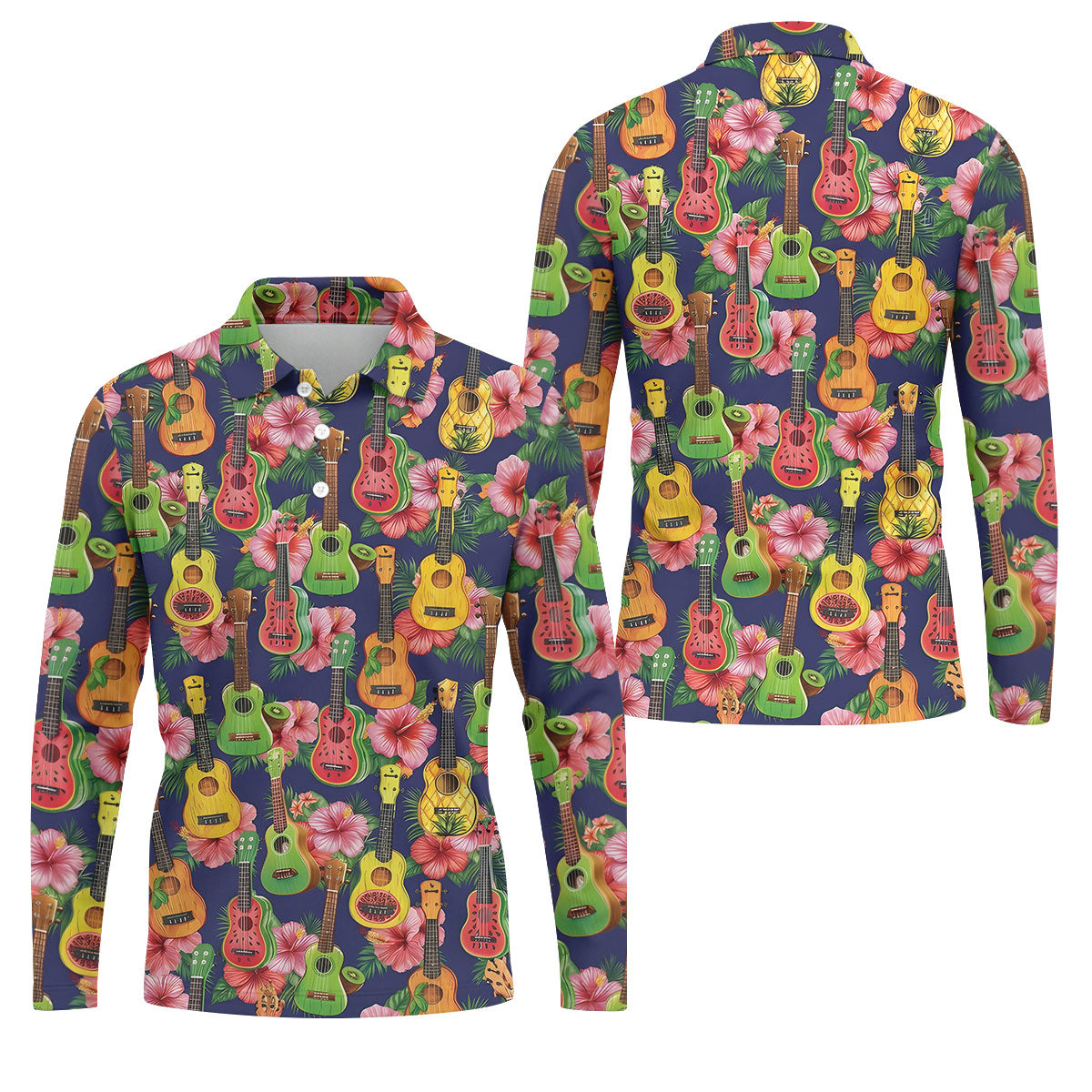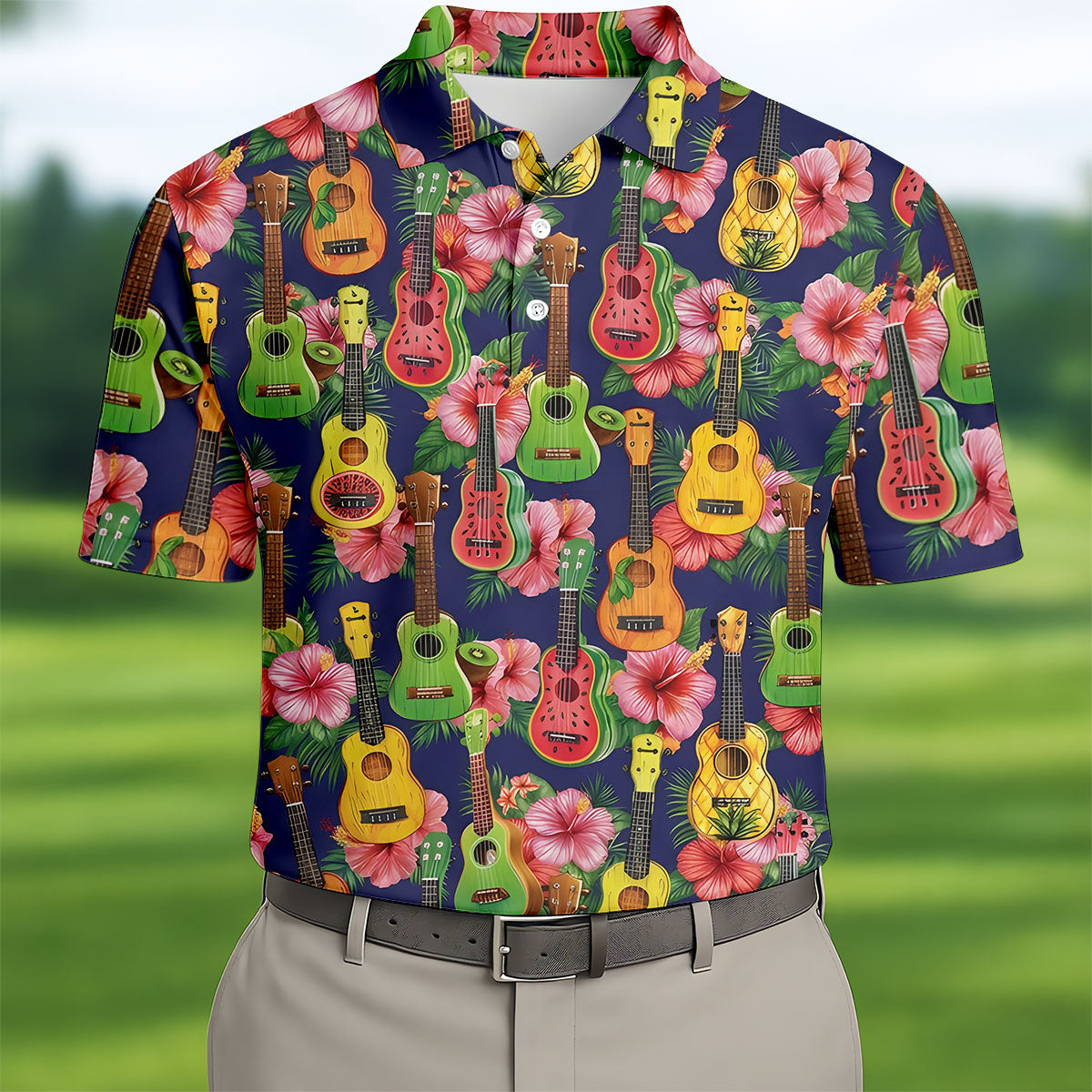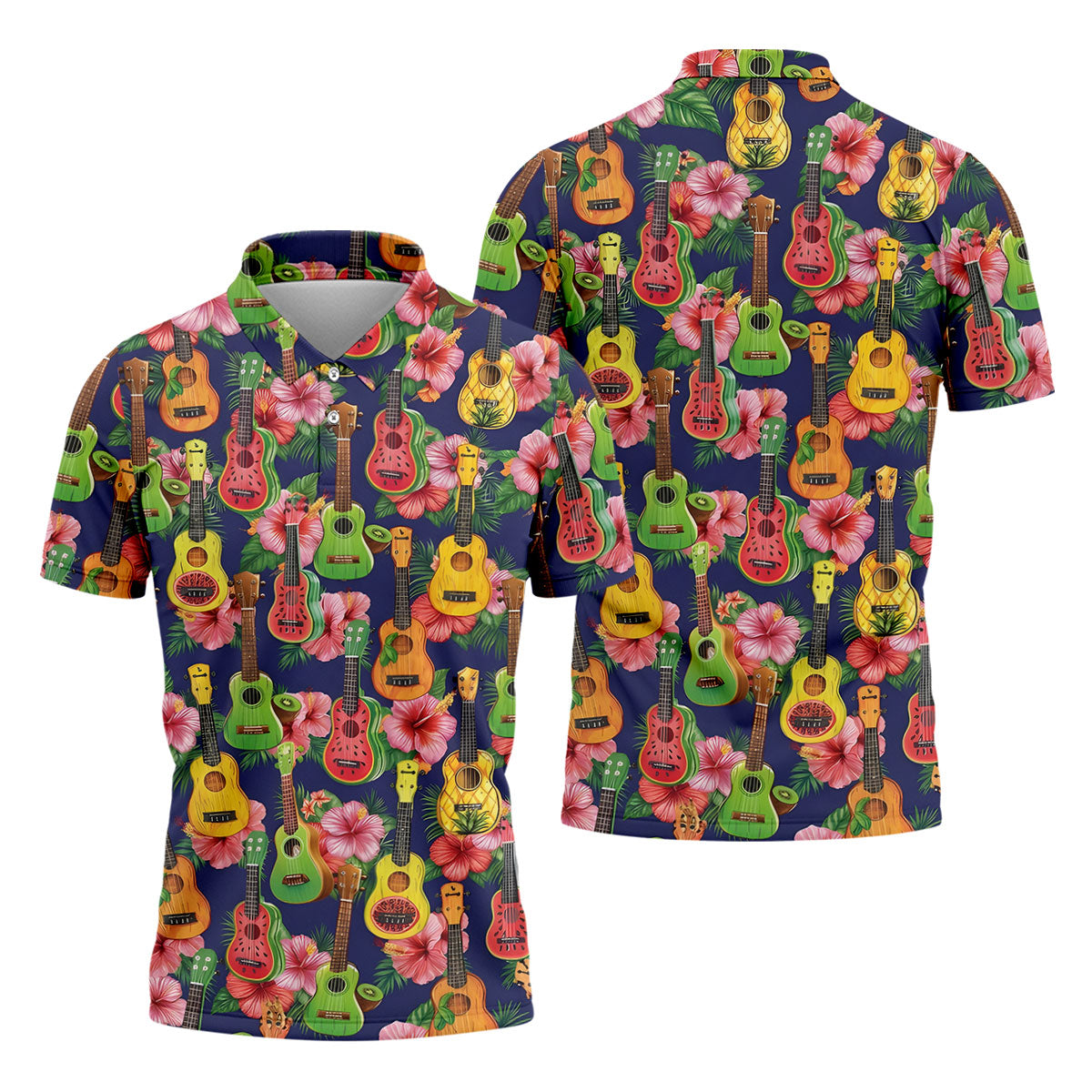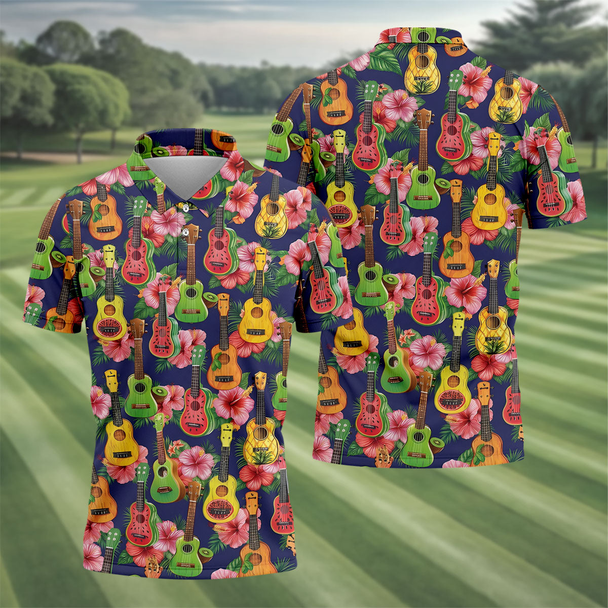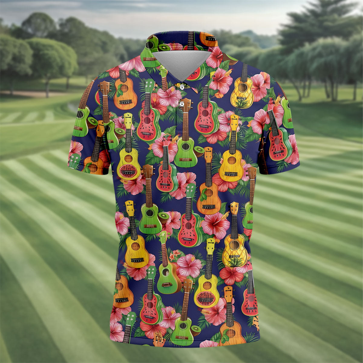 Tropical Ukulele Fruit Pattern 250 Retro Golf Shirt, Hawaiian Vibe Golf Shirts For Men