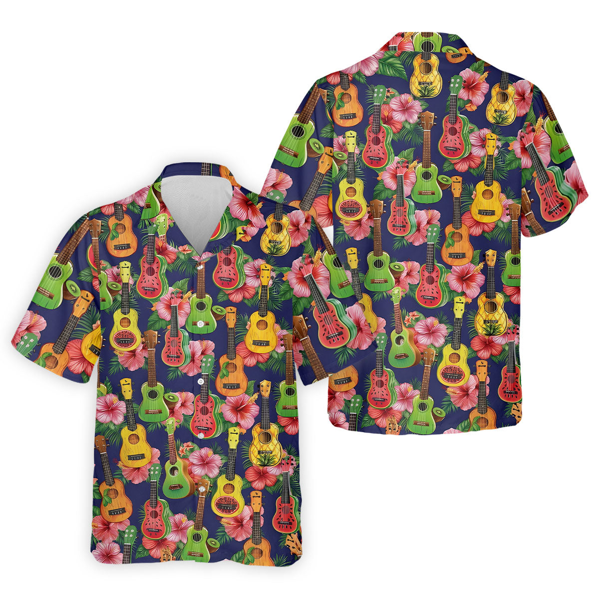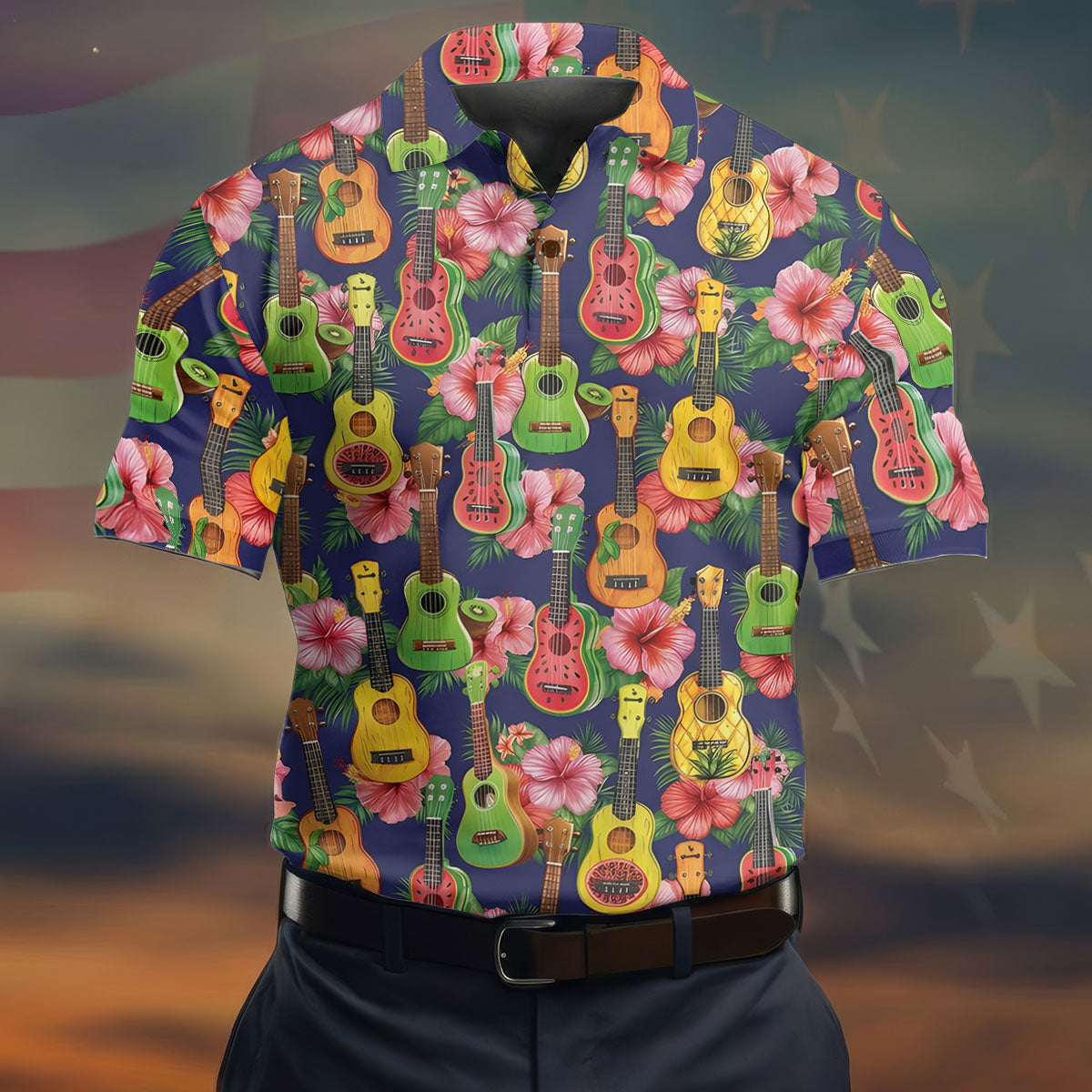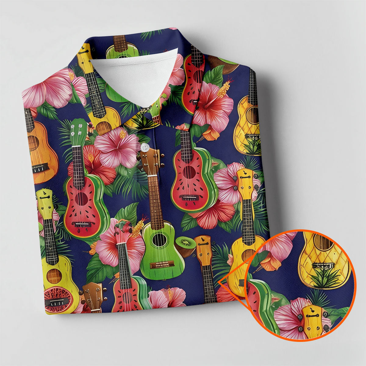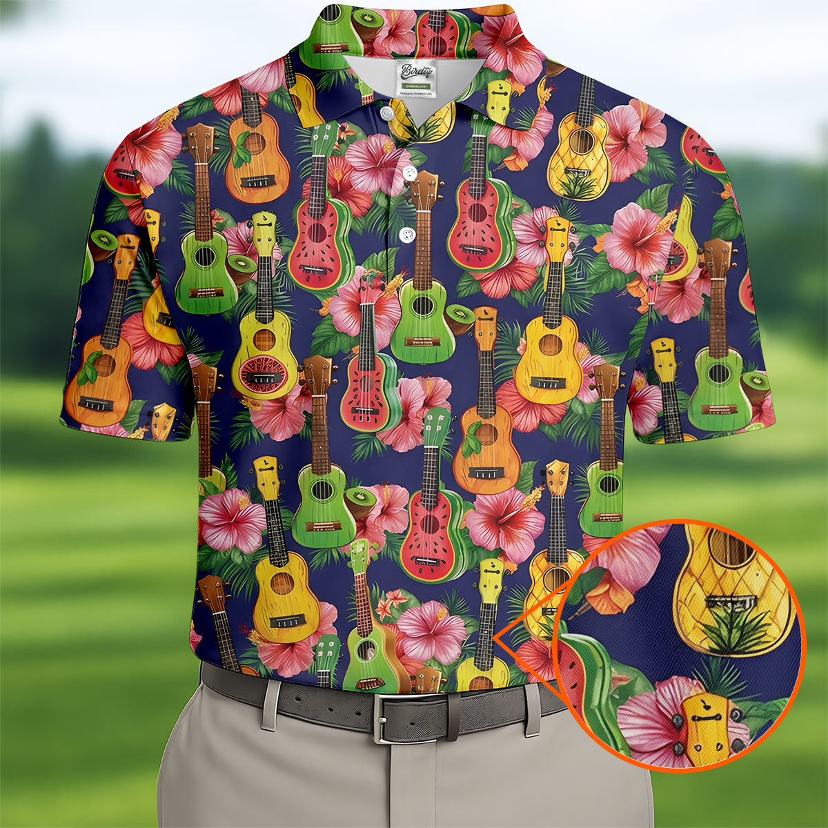 Tropical Ukulele Fruit Pattern 250 Retro Golf Shirt, Hawaiian Vibe Golf Shirts For Men