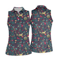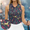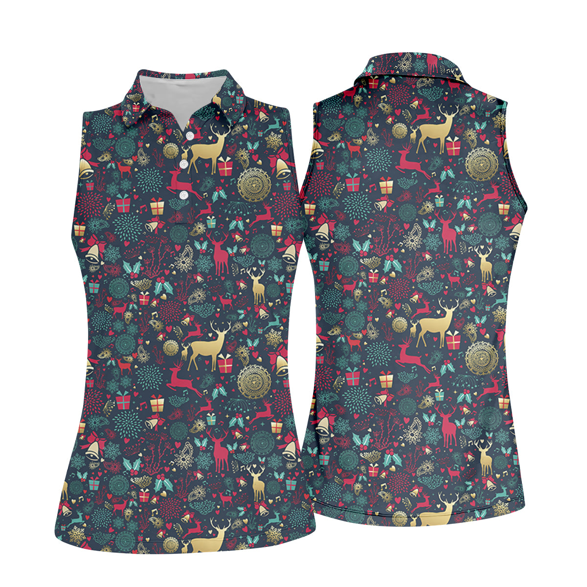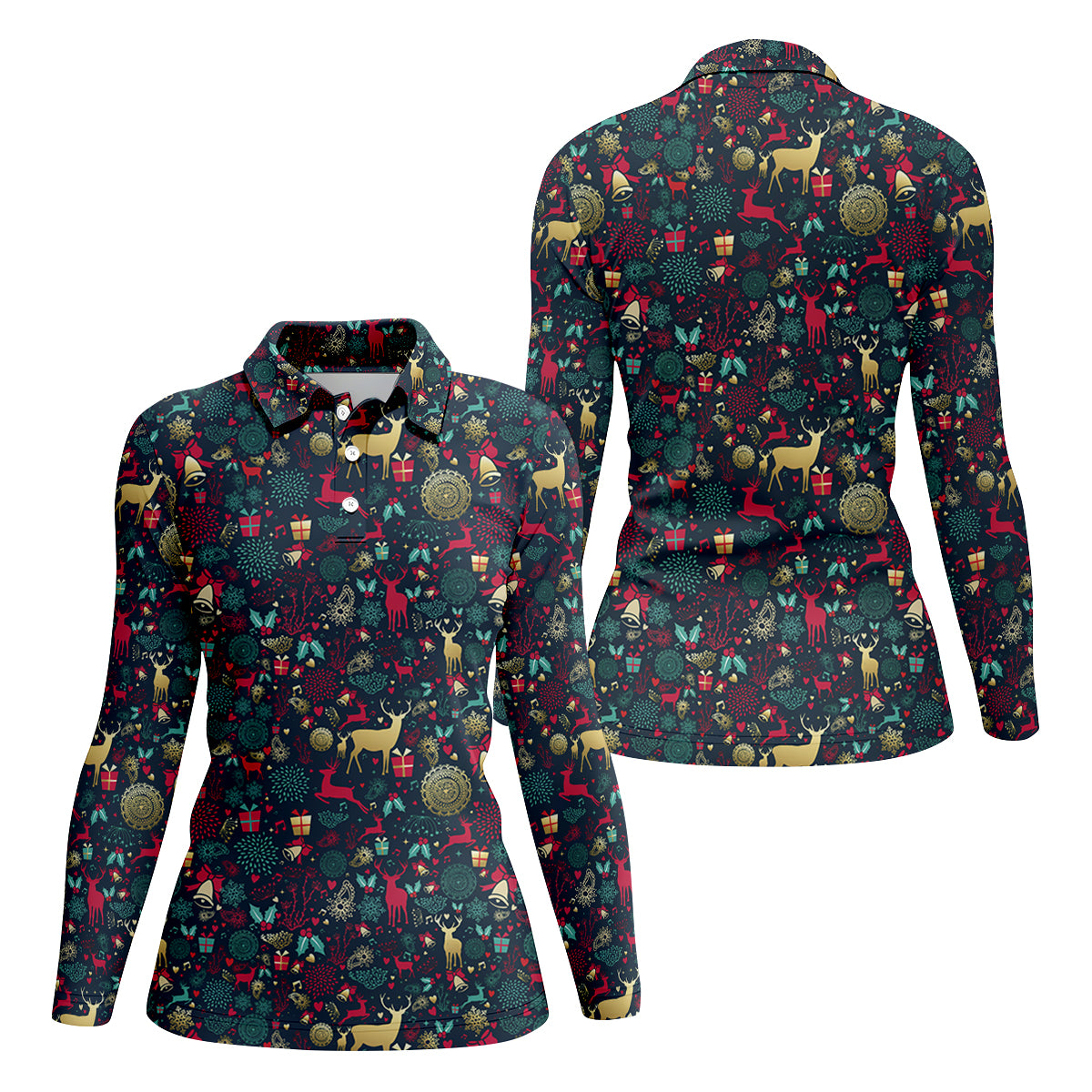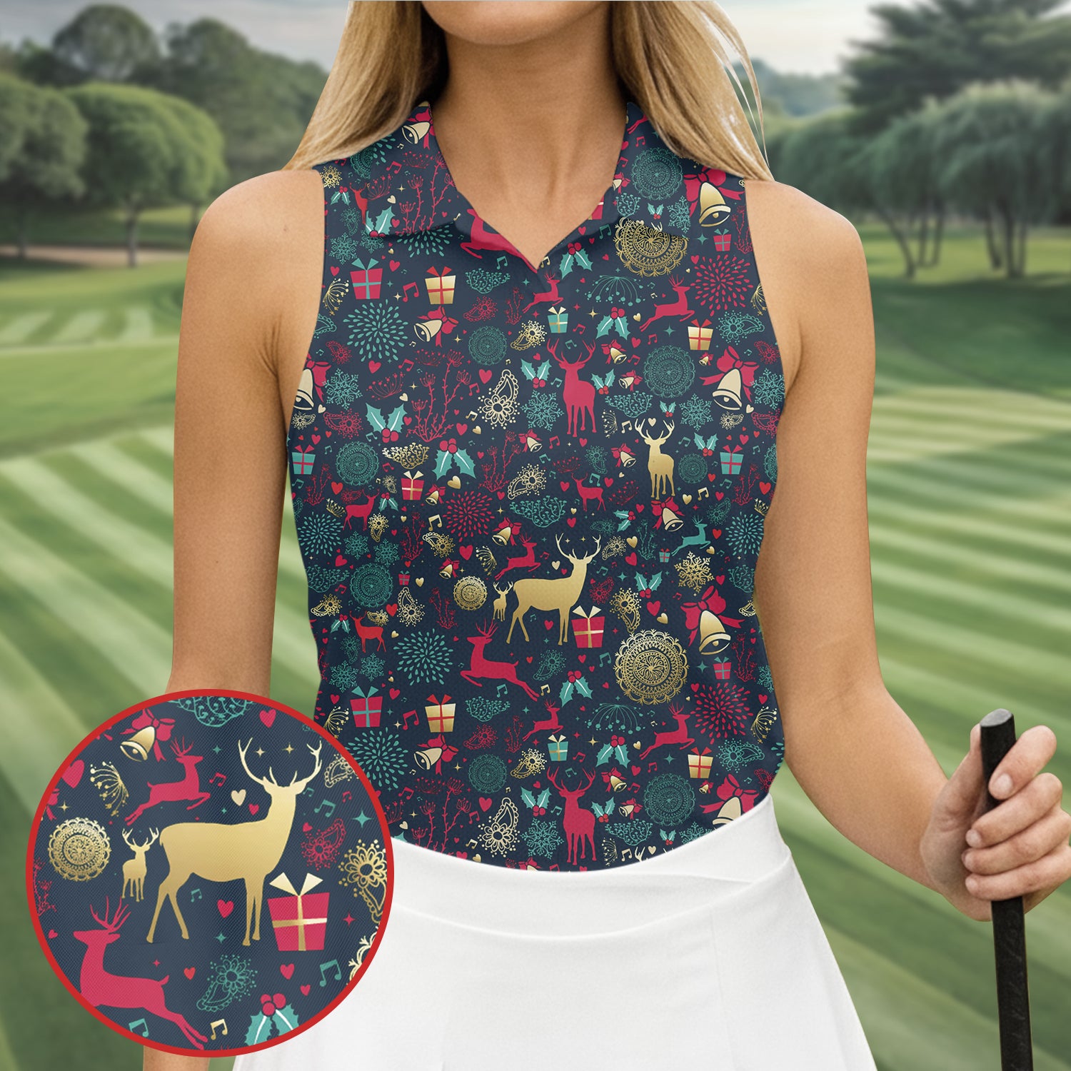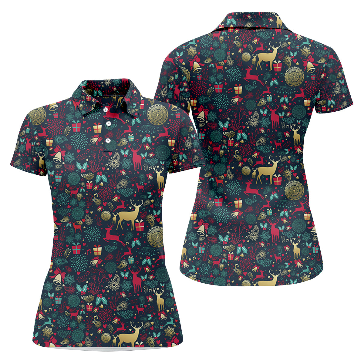 Vintage Reindeer Bell Dark Navy Christmas Golf Tops For Women, Gift Christmas Golf Shirt Polos, Ladies Golf Apparel