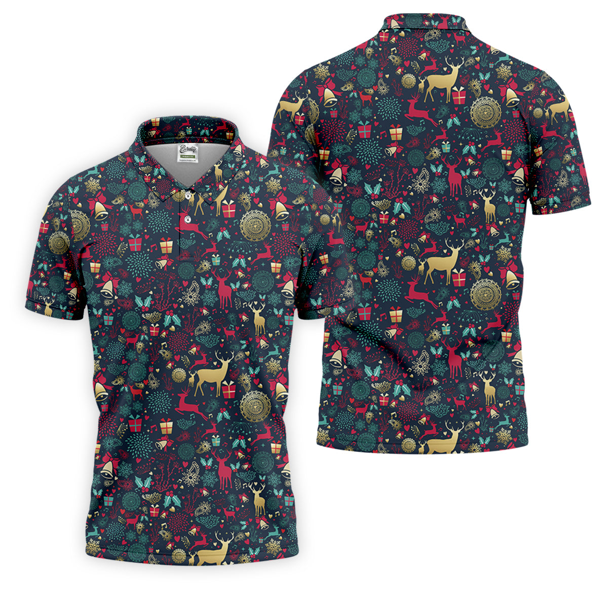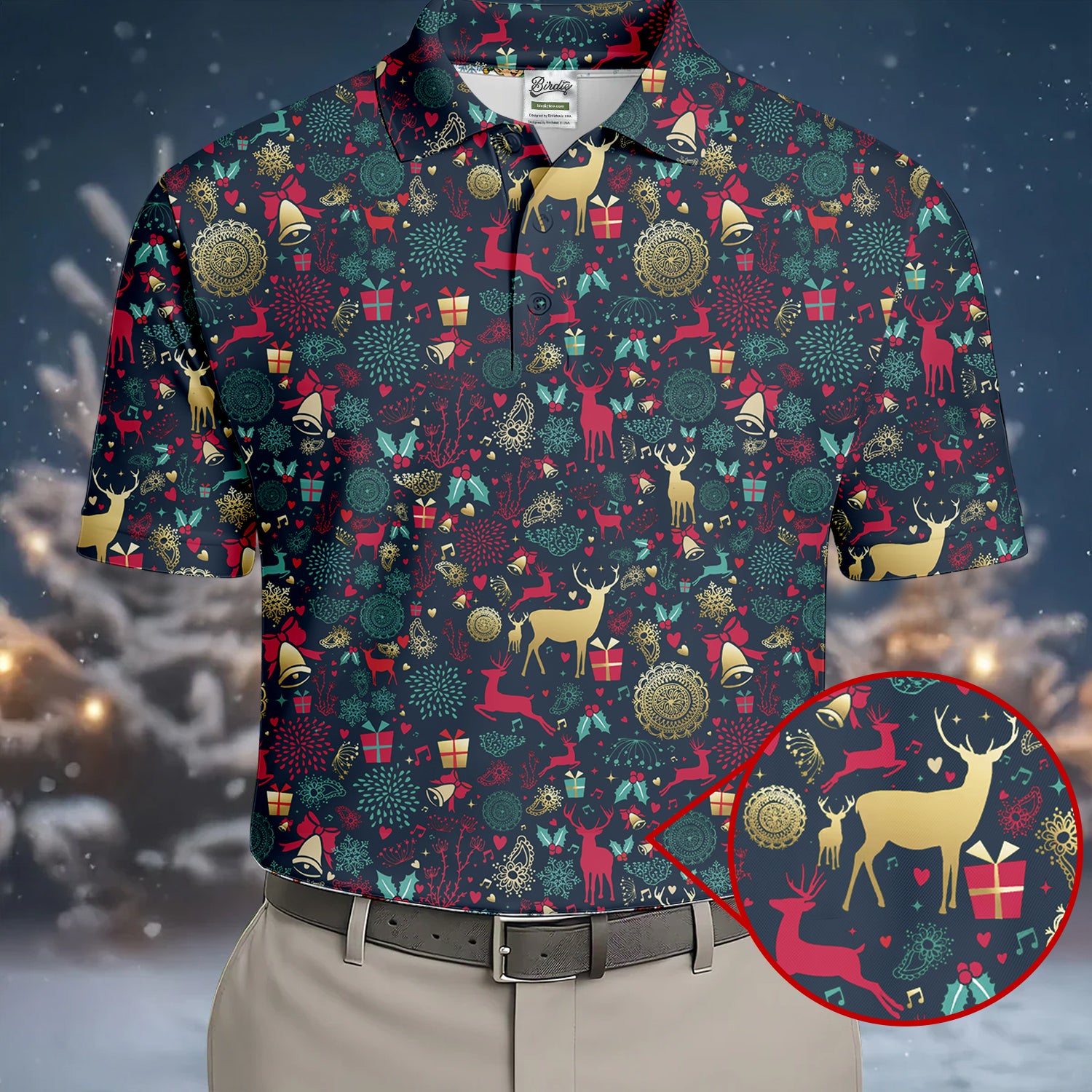 Vintage Reindeer Bell Dark Navy Christmas Golf Tops For Men, Gift Christmas Golf Shirt Polos, Men Golf Apparel