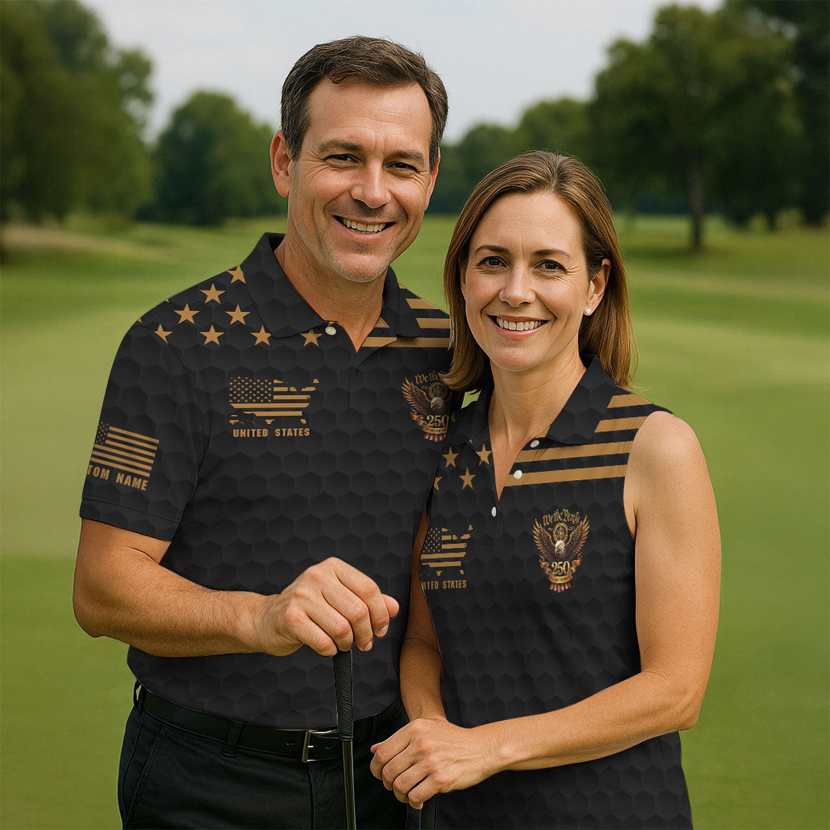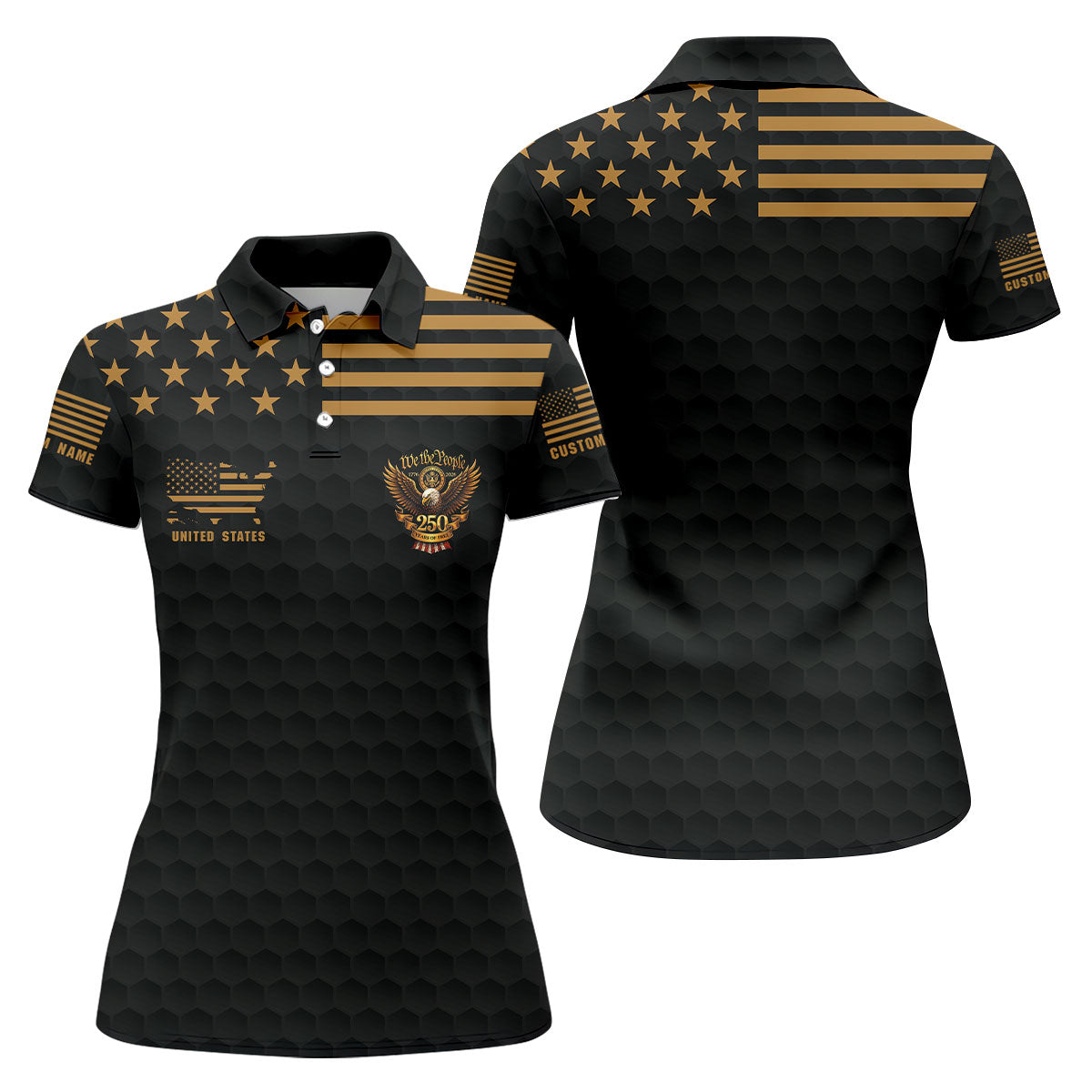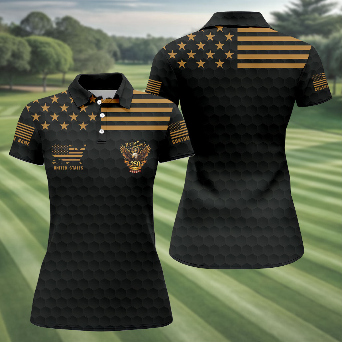 We The People 250 Years Golf Ball Pattern Black Golf Shirt, 4th Of July Patriotic Golf Shirt For Women