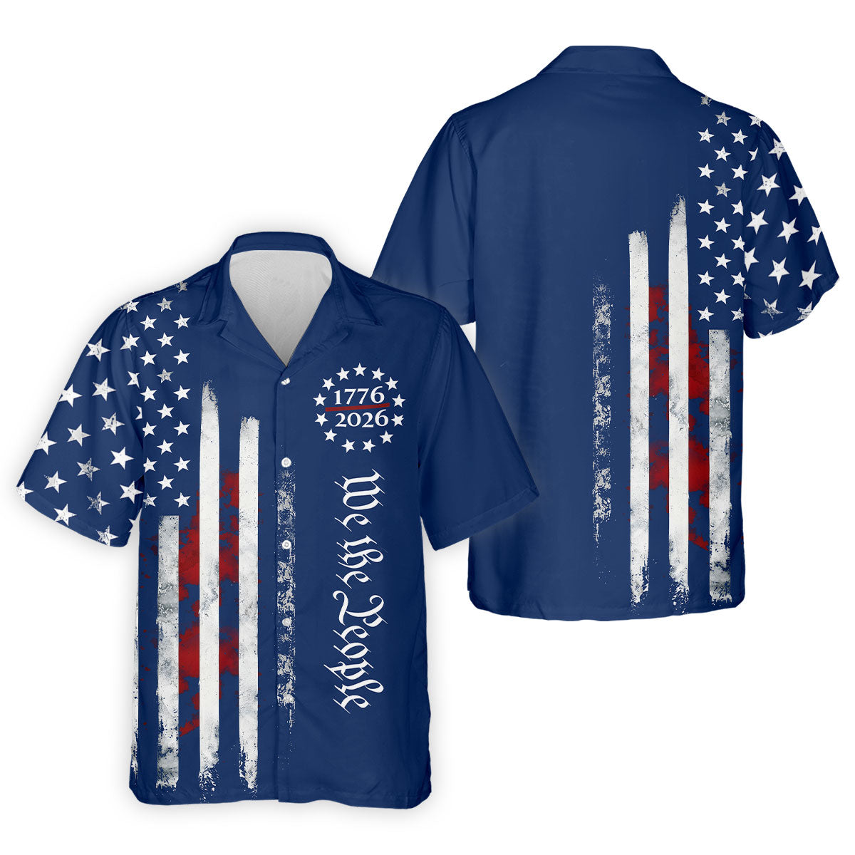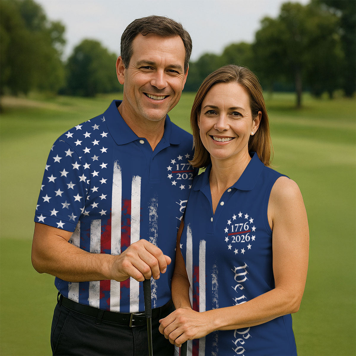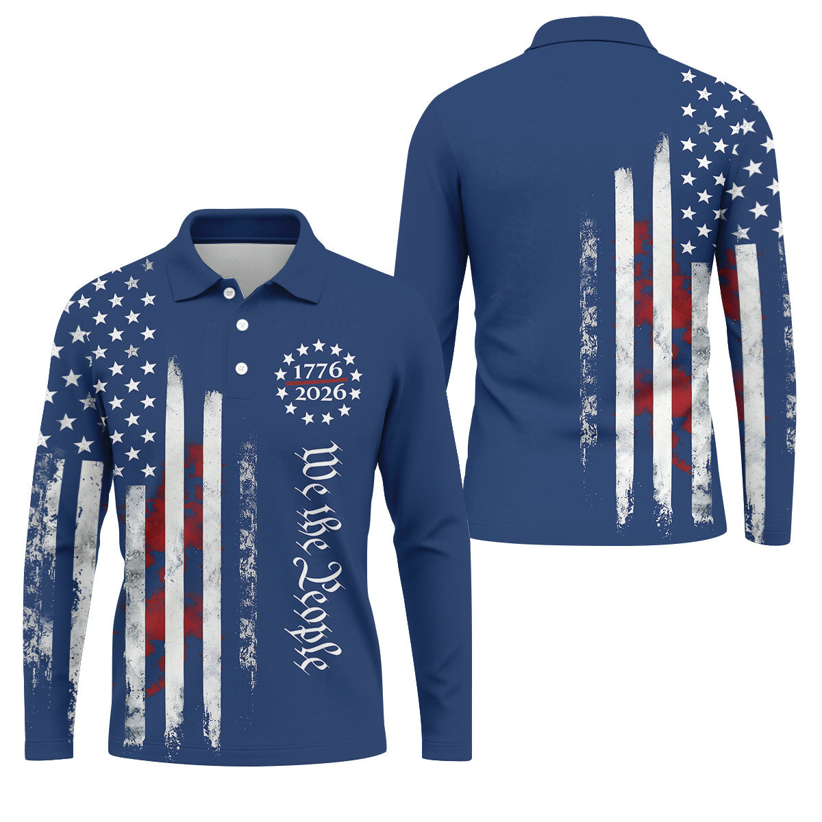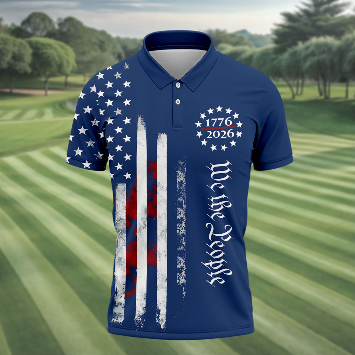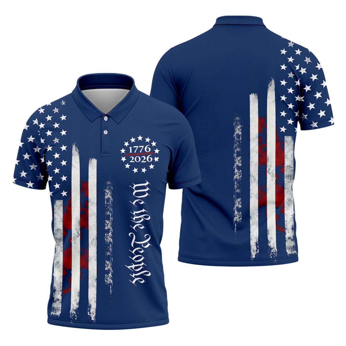 We The People Distressed Flag Patriotic Blue Golf Shirt, 250 Years 4th Of July Golf Shirts For Men