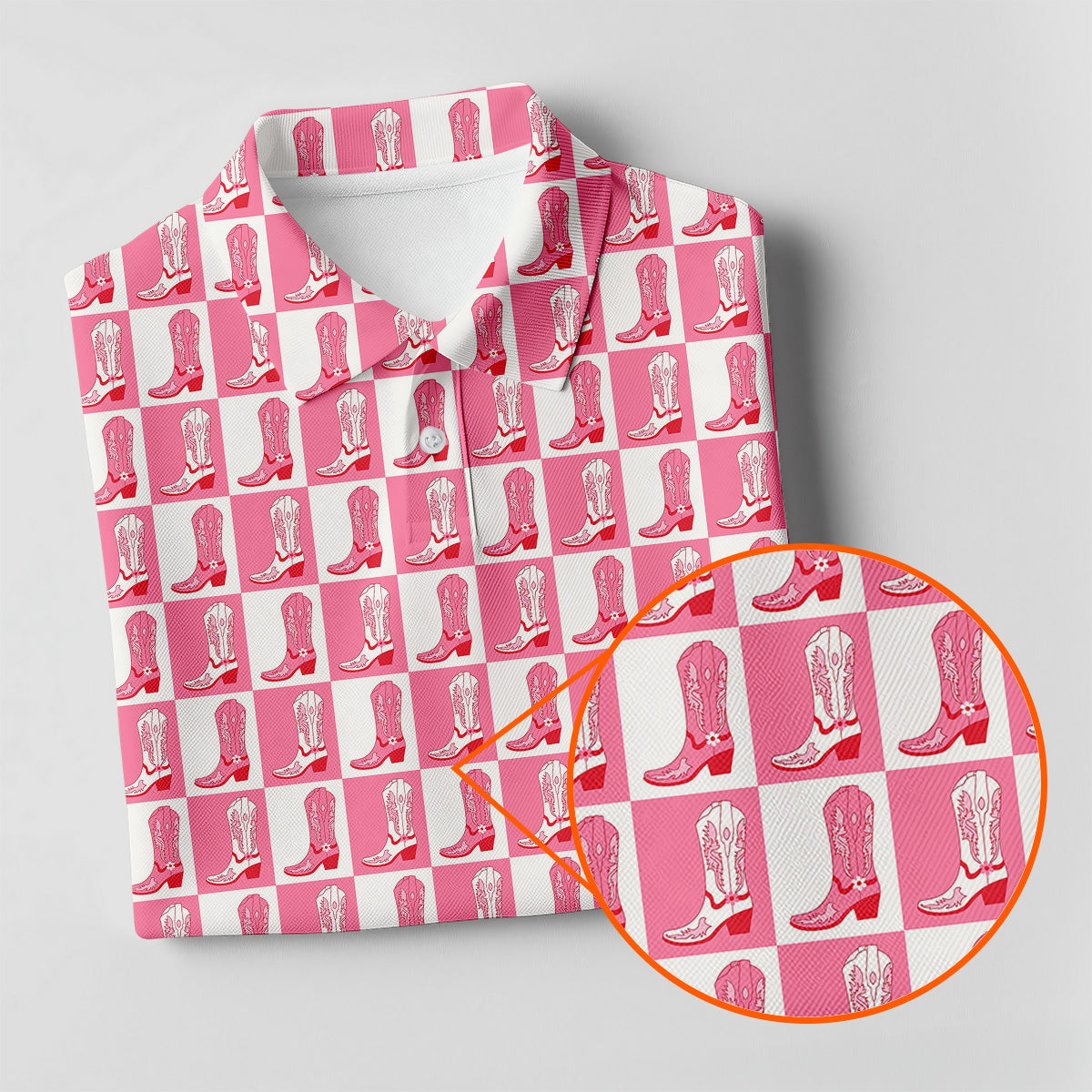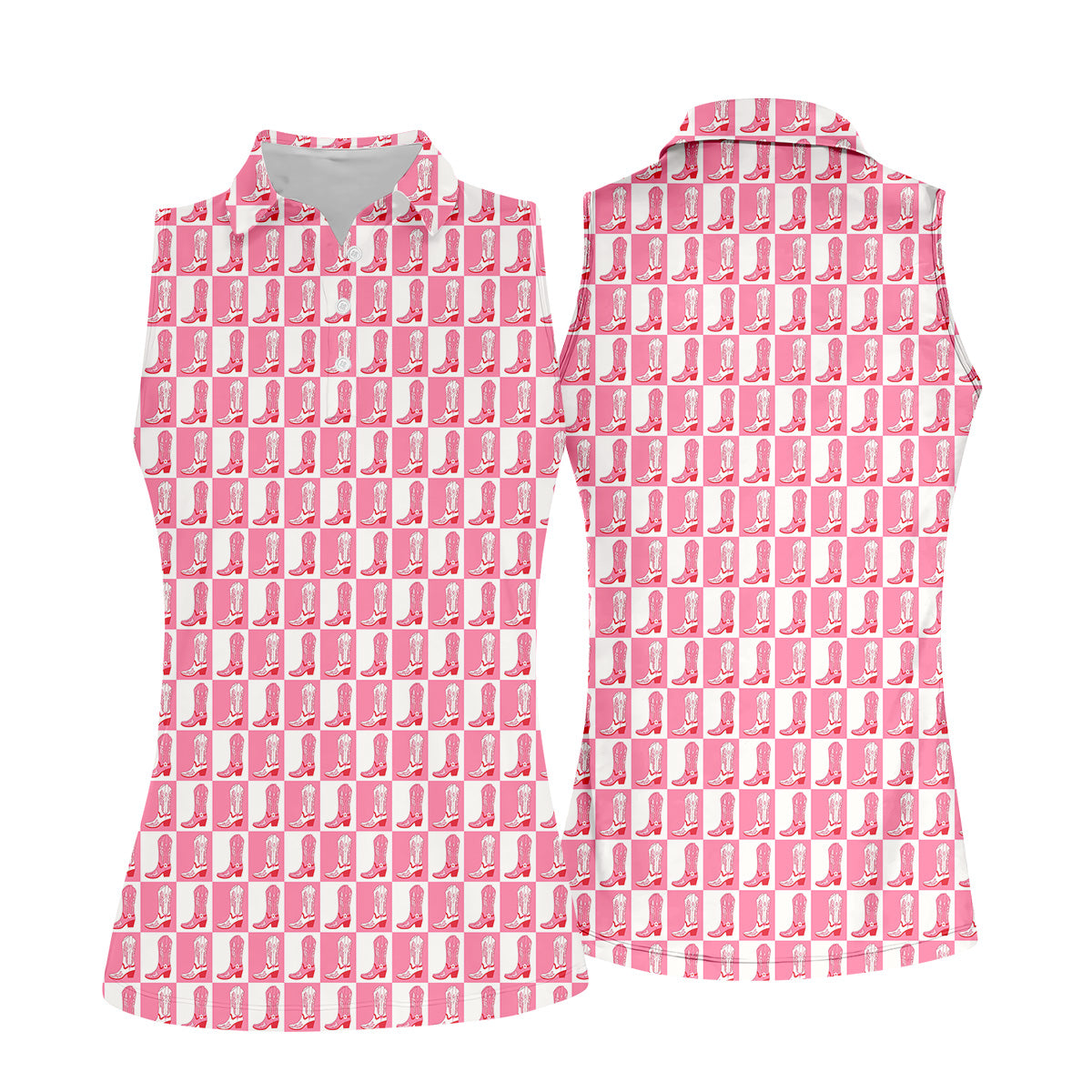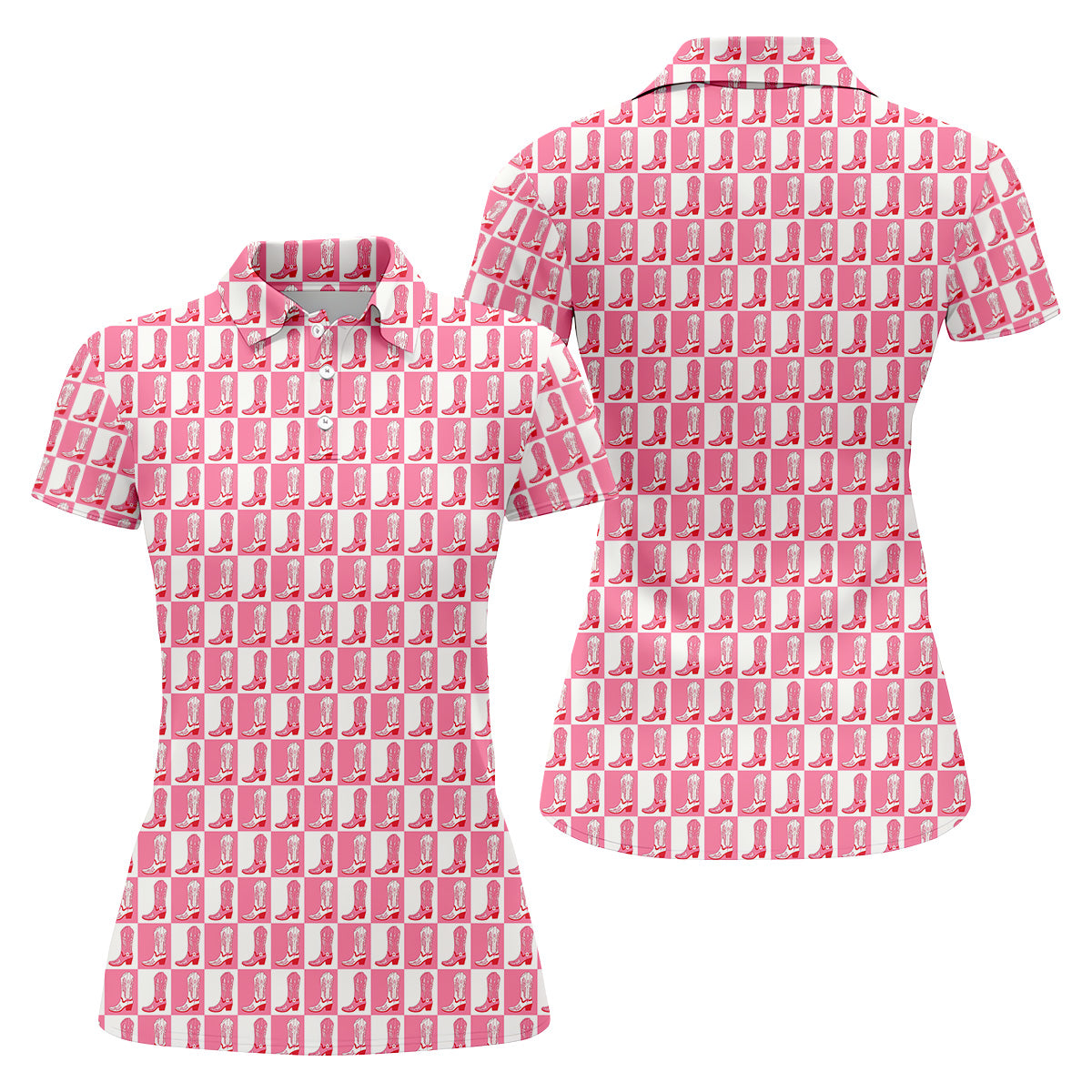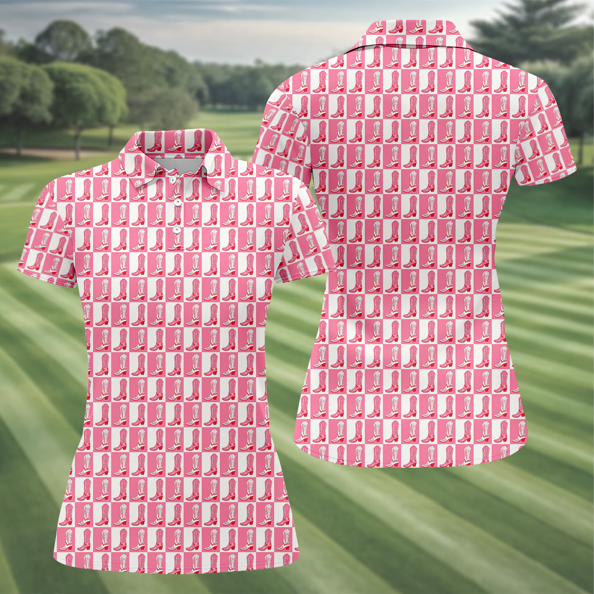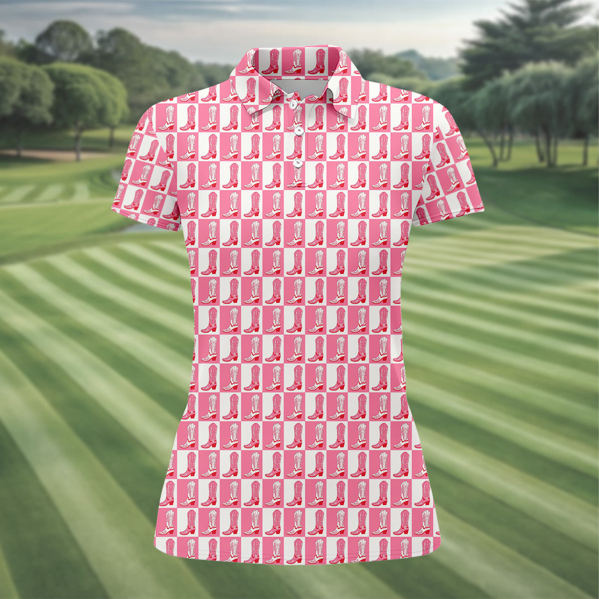 Meet the Western Cowgirl Boot Ladies Pink Golf Shirt, Western Golf Shirts Women, Ladies Golf Polos – a shirt so bold it makes argyle cry in the corner. Designed for golfers who'd rather make a fashion statement than follow dress codes, this polo is your ticket to turning heads, raising eyebrows, and maybe distracting your buddies just enough to win a few holes. (We’re not saying it’s cheating... we’re saying it’s strategy.)