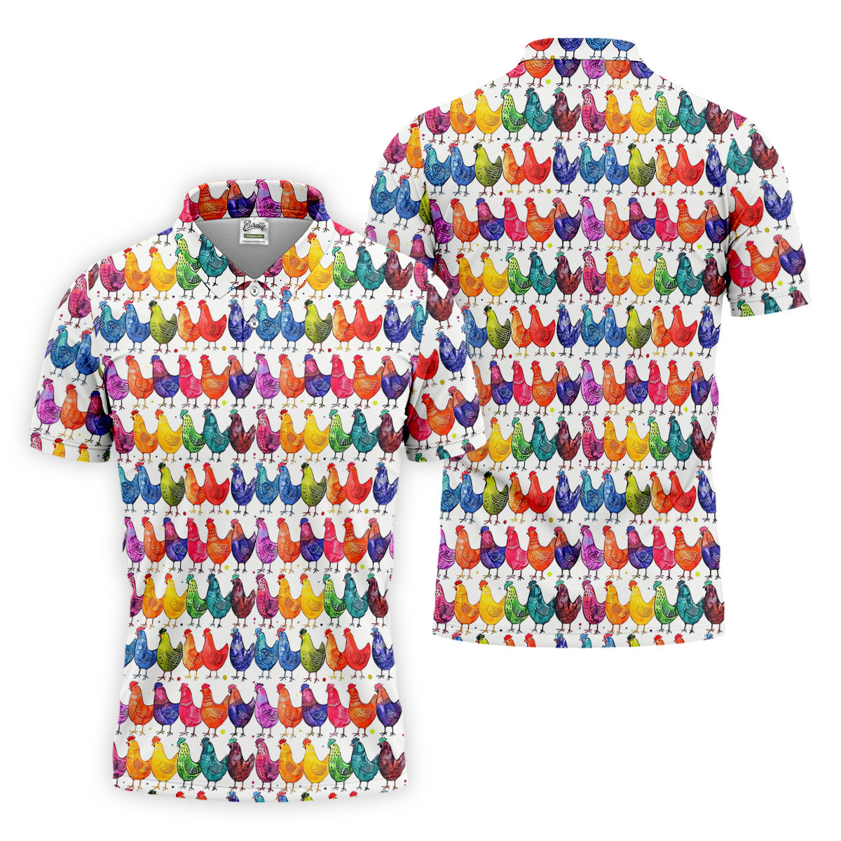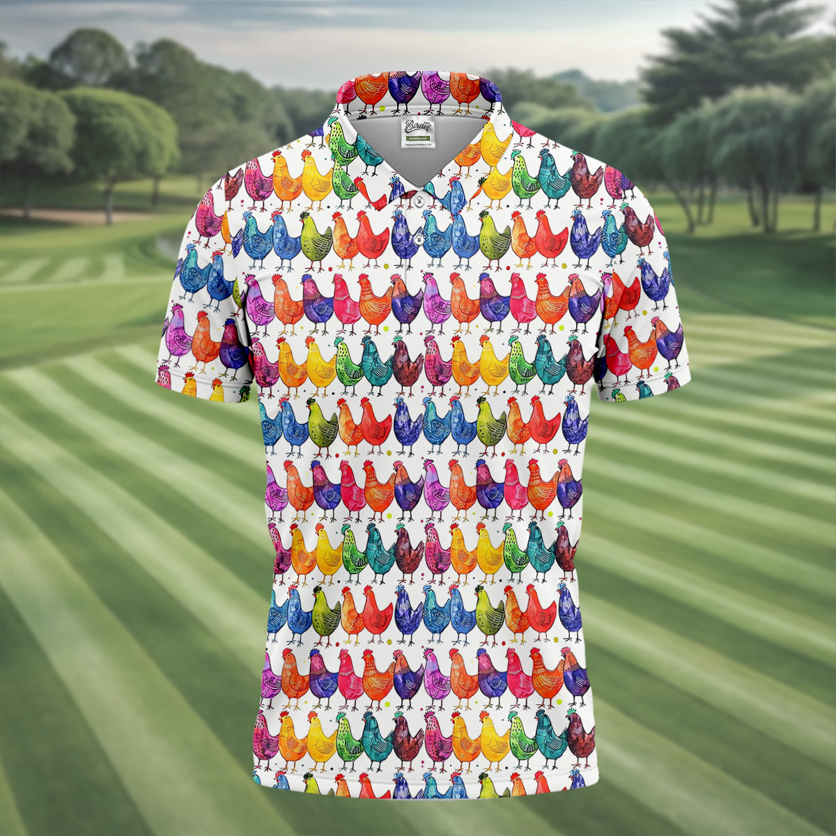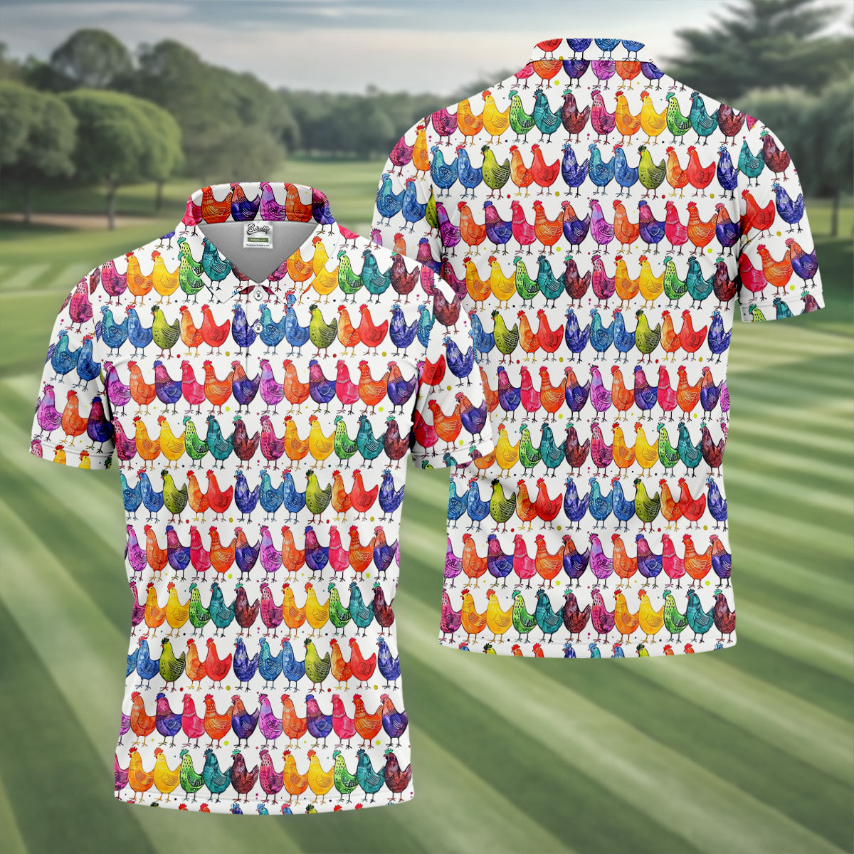 Whimsical Chicken Colorful Golf Shirt, Cute Golf Outfit, Polo Shirts For Men, Golfing Apparel