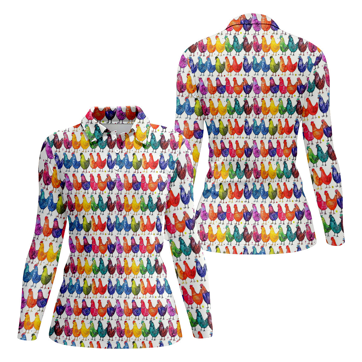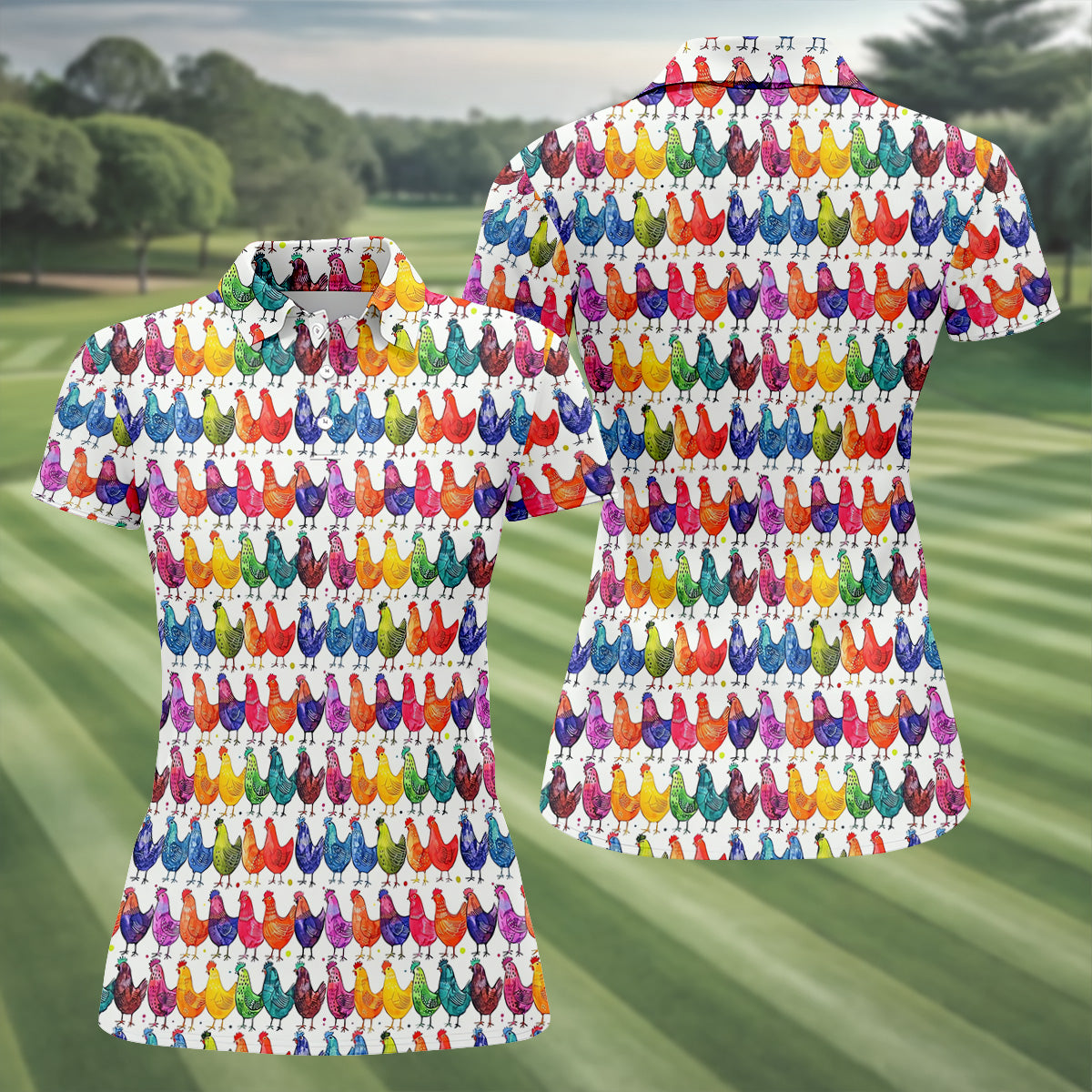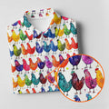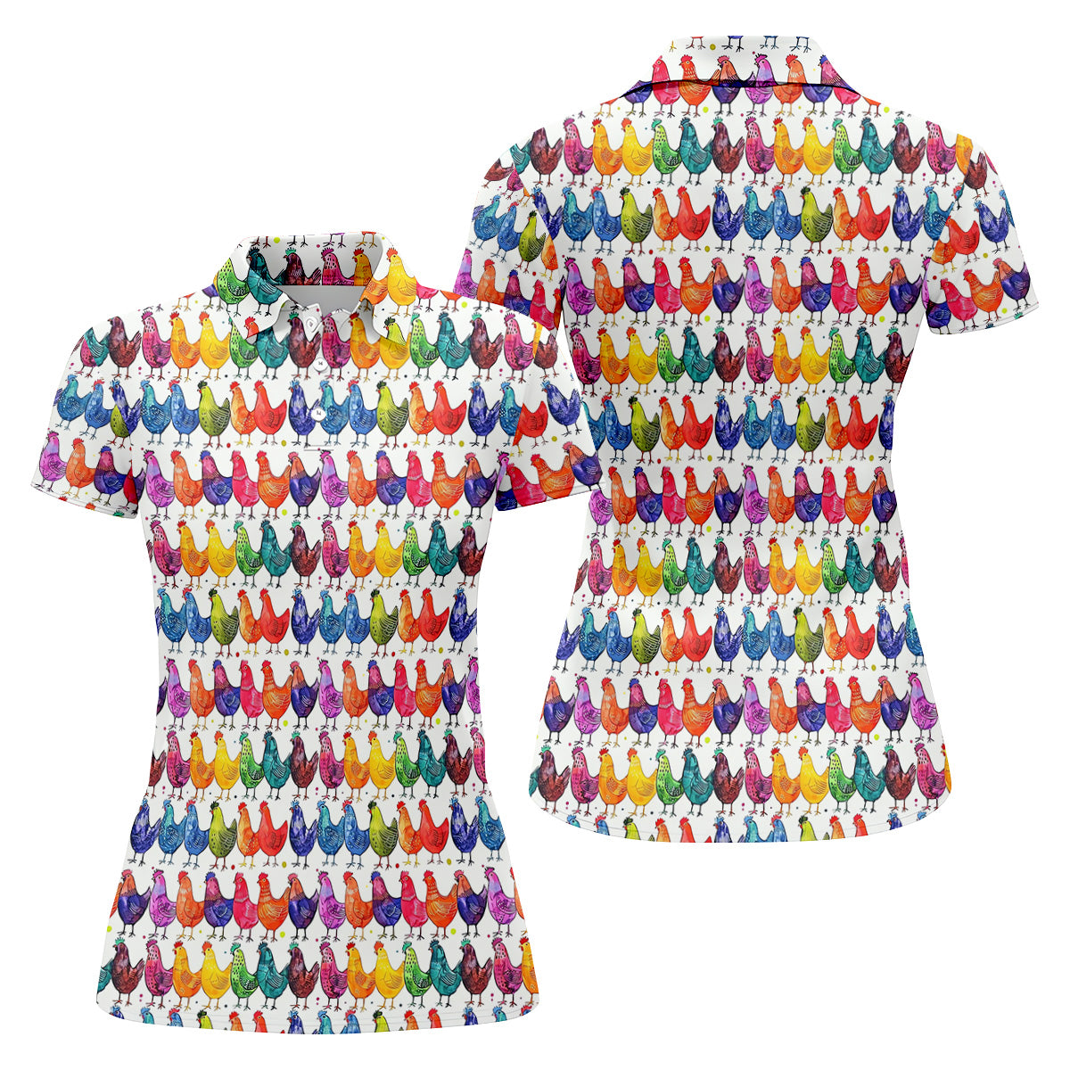 Whimsical Chicken Colorful Golf Shirt, Cute Golf Outfit, White Polo Women, Ladies Golf Shirts
