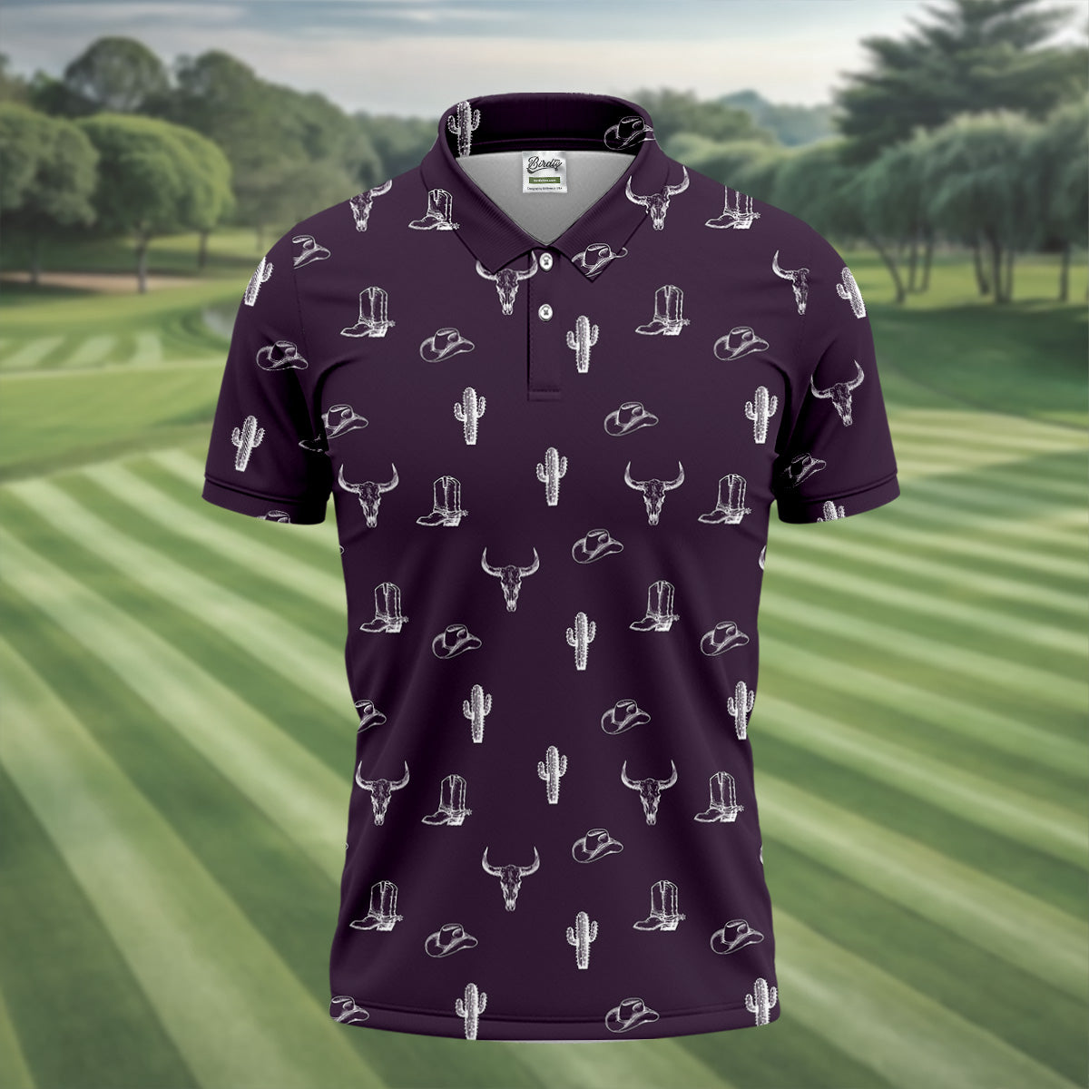 Meet the Wild West Cactus Purple Western Golf Shirt, Golf Tops For Men, Polo Shirts For Men, Golfing Apparel – a shirt so bold it makes argyle cry in the corner. Designed for golfers who'd rather make a fashion statement than follow dress codes, this polo is your ticket to turning heads, raising eyebrows, and maybe distracting your buddies just enough to win a few holes. (We’re not saying it’s cheating... we’re saying it’s strategy.)